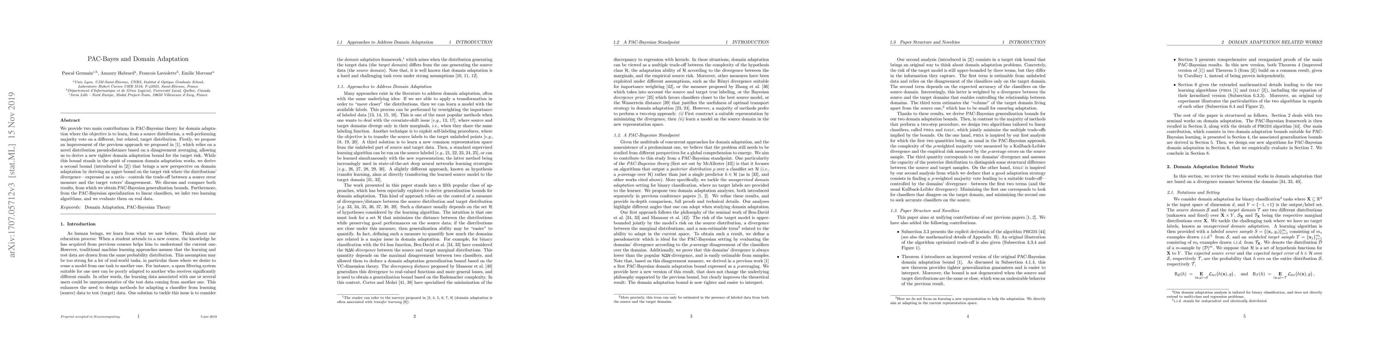 This paper improves PAC-Bayesian theory for domain adaptation by proposing a new tighter domain adaptation bound based on a novel pseudodistance and introducing a second bound that controls the trade-off between source and target distributions. The authors evaluate the derived bounds and propose two learning algorithms for linear classifiers, which they test on real data.