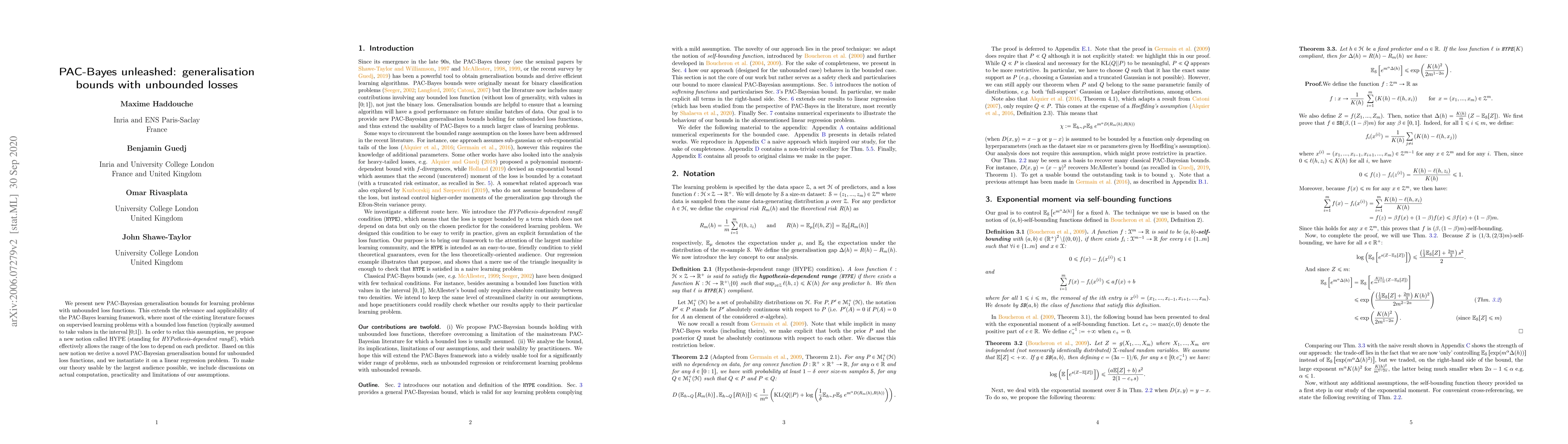 This paper extends PAC-Bayesian generalisation bounds to learning problems with unbounded loss functions using a new concept called HYPE, which allows loss ranges to vary by predictor. It provides a novel PAC-Bayesian bound for such scenarios and demonstrates its application on linear regression, while discussing practical implications and limitations.