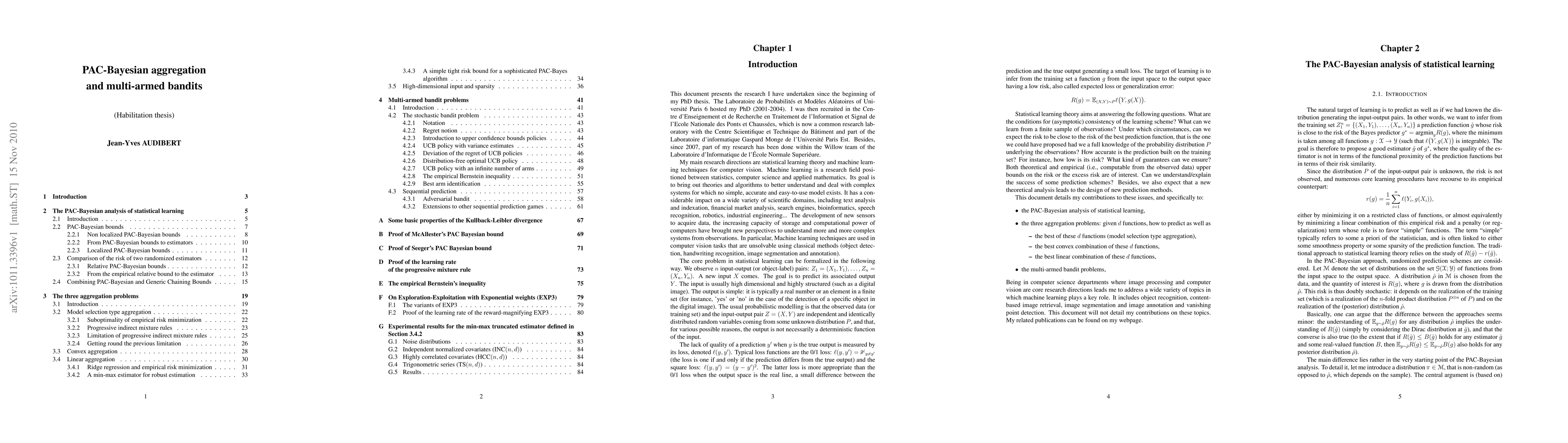 This habilitation thesis presents several contributions to (1) the PAC-Bayesian analysis of statistical learning, (2) the three aggregation problems: given d functions, how to predict as well as (i) the best of these d functions (model selection type aggregation), (ii) the best convex combination of these d functions, (iii) the best linear combination of these d functions, (3) the multi-armed bandit problems.
