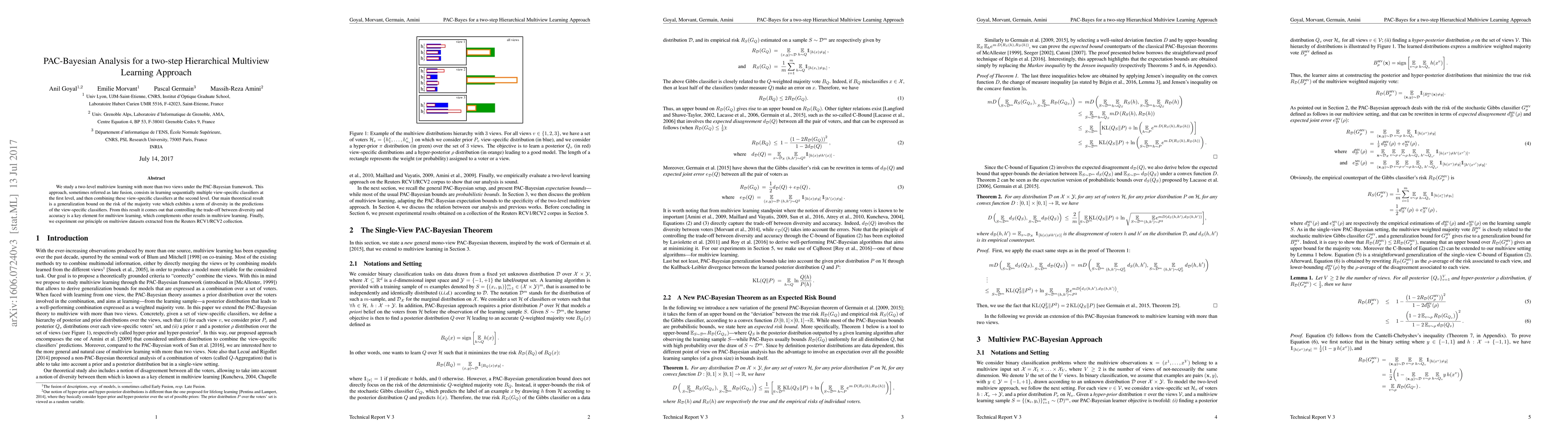 This paper proposes a two-step hierarchical multiview learning approach under the PAC-Bayesian framework, where multiple view-specific classifiers are sequentially learned and then combined. The key theoretical result is a generalization bound that highlights the importance of diversity in predictions for optimal performance.