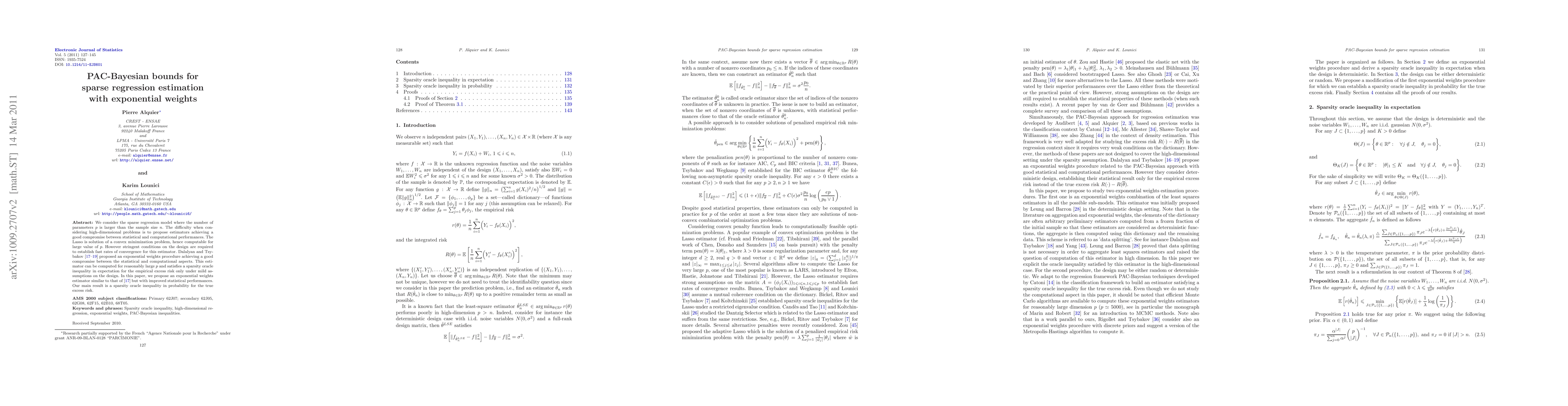 Researchers propose a new estimator for sparse regression with exponential weights that achieves a balance between statistical performance and computational feasibility. Their method provides improved statistical properties and can be computed efficiently for reasonably large values of p.