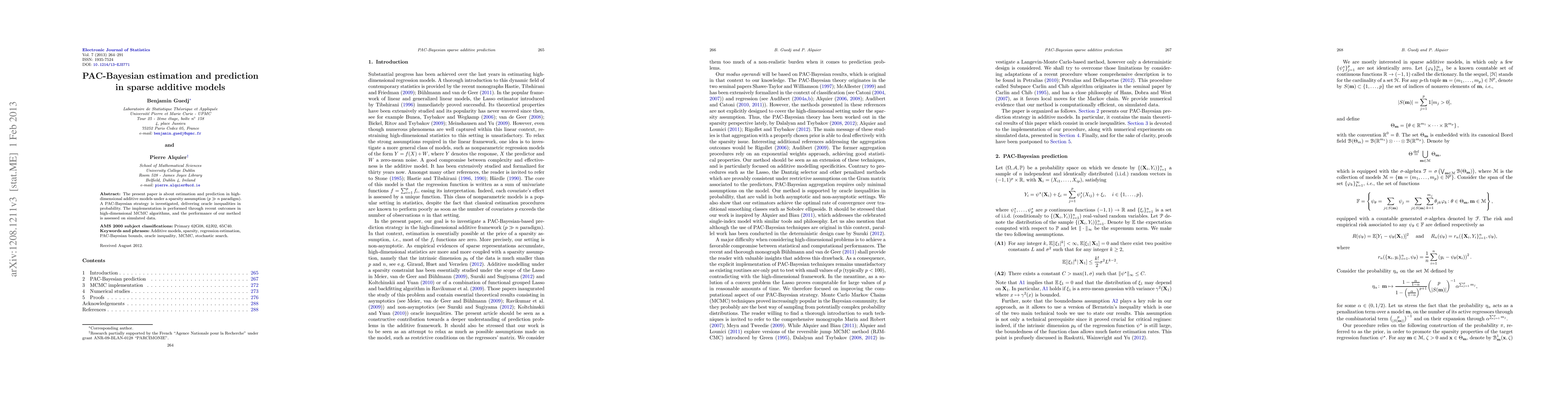 This paper explores PAC-Bayesian strategies for estimating and predicting in high-dimensional sparse additive models, achieving oracle inequalities. The method leverages recent advancements in high-dimensional MCMC algorithms and is evaluated on simulated data.