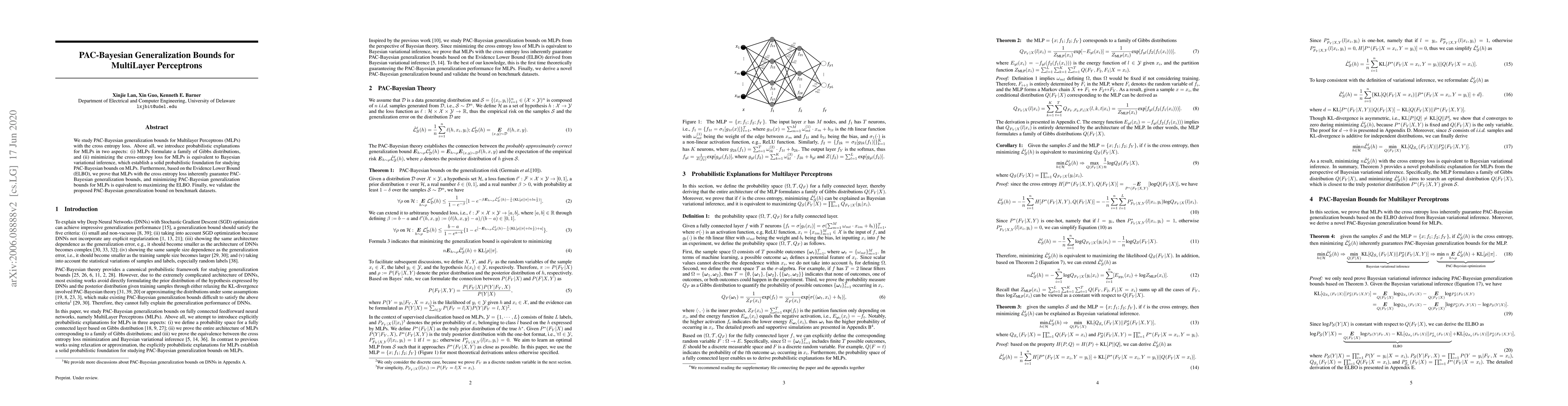 We study PAC-Bayesian generalization bounds for Multilayer Perceptrons (MLPs) with the cross entropy loss. Above all, we introduce probabilistic explanations for MLPs in two aspects: (i) MLPs formulate a family of Gibbs distributions, and (ii) minimizing the cross-entropy loss for MLPs is equivalent to Bayesian variational inference, which establish a solid probabilistic foundation for studying PAC-Bayesian bounds on MLPs. Furthermore, based on the Evidence Lower Bound (ELBO), we prove that MLPs with the cross entropy loss inherently guarantee PAC- Bayesian generalization bounds, and minimizing PAC-Bayesian generalization bounds for MLPs is equivalent to maximizing the ELBO. Finally, we validate the proposed PAC-Bayesian generalization bound on benchmark datasets.