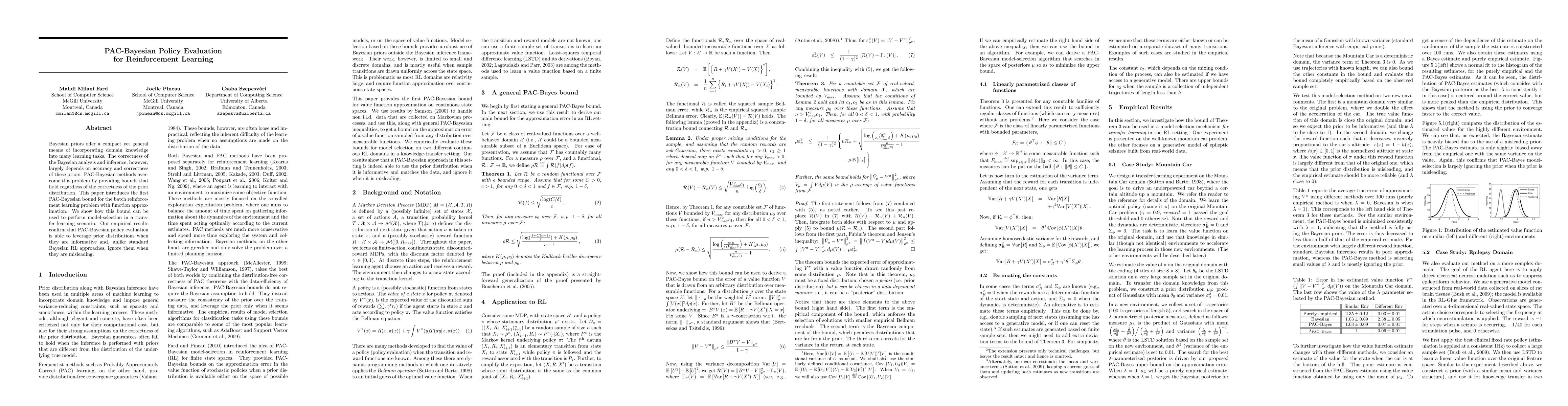 Bayesian priors offer a compact yet general means of incorporating domain knowledge into many learning tasks. The correctness of the Bayesian analysis and inference, however, largely depends on accuracy and correctness of these priors. PAC-Bayesian methods overcome this problem by providing bounds that hold regardless of the correctness of the prior distribution. This paper introduces the first PAC-Bayesian bound for the batch reinforcement learning problem with function approximation. We show how this bound can be used to perform model-selection in a transfer learning scenario. Our empirical results confirm that PAC-Bayesian policy evaluation is able to leverage prior distributions when they are informative and, unlike standard Bayesian RL approaches, ignore them when they are misleading.