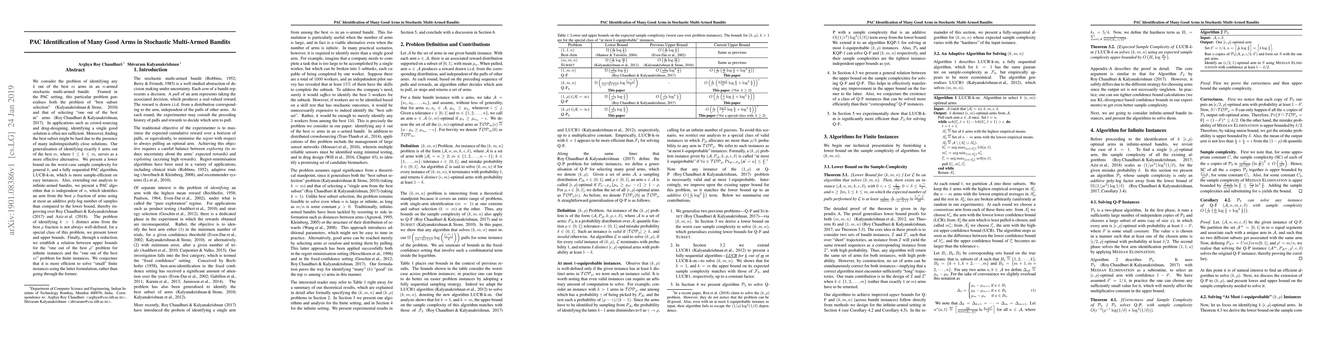 This paper addresses the problem of identifying $k$ out of the best $m$ arms in stochastic multi-armed bandits within the PAC framework, presenting a new sequential algorithm \GLUCB that is more sample-efficient. It also extends the analysis to infinite-armed bandits, providing a PAC algorithm that identifies an arm from the best $\rho$ fraction with improved sample complexity.