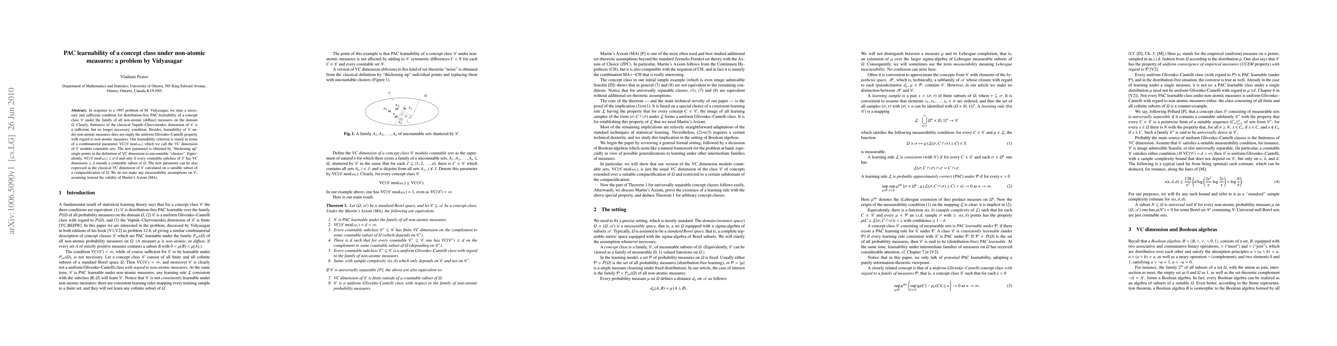 This paper provides a necessary and sufficient condition for the distribution-free PAC learnability of a concept class under non-atomic measures, introducing a new combinatorial parameter called the VC dimension of $\mathscr C$ modulo countable sets. This parameter replaces the classical Vapnik-Chervonenkis dimension and ensures learnability without implying the uniform Glivenko-Cantelli property.