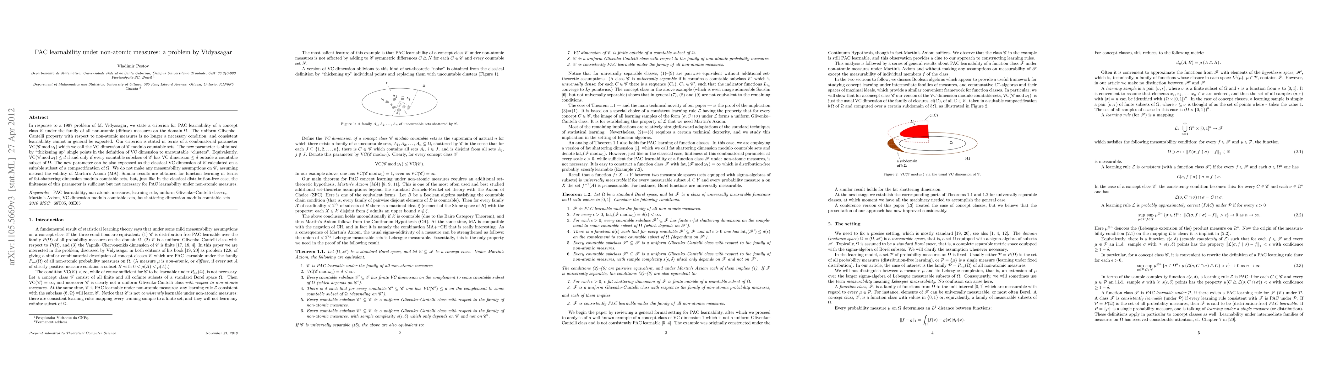 This paper addresses M. Vidyasagar's 1997 problem on PAC learnability under non-atomic measures, proposing a new criterion based on a combinatorial parameter called the VC dimension modulo countable sets. Unlike the uniform Glivenko-Cantelli property, this new parameter, which considers "clusters" instead of single points, is sufficient but not necessary for PAC learnability.