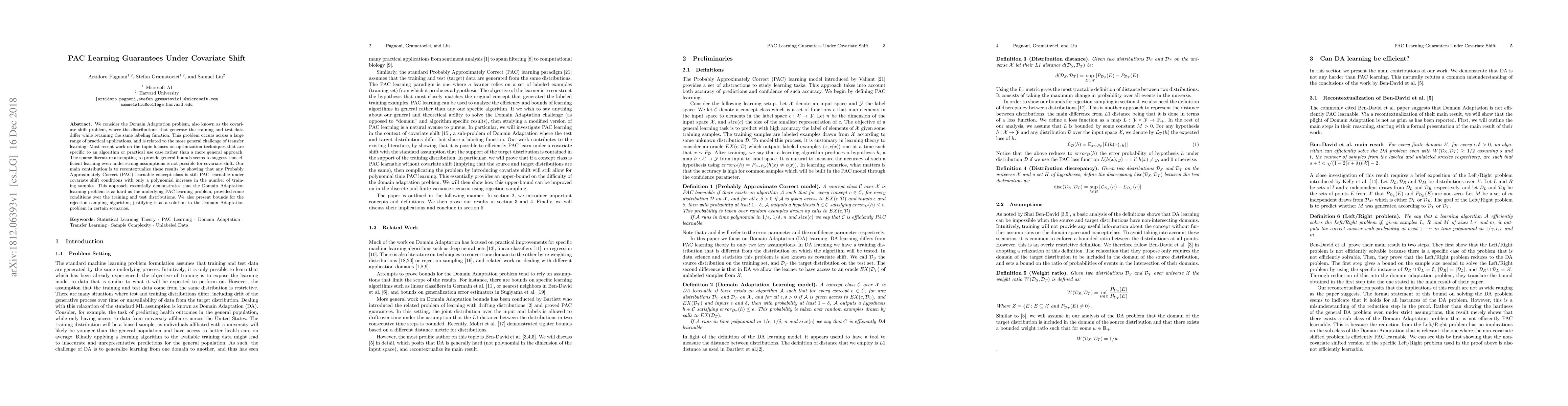 We consider the Domain Adaptation problem, also known as the covariate shift problem, where the distributions that generate the training and test data differ while retaining the same labeling function. This problem occurs across a large range of practical applications, and is related to the more general challenge of transfer learning. Most recent work on the topic focuses on optimization techniques that are specific to an algorithm or practical use case rather than a more general approach. The sparse literature attempting to provide general bounds seems to suggest that efficient learning even under strong assumptions is not possible for covariate shift. Our main contribution is to recontextualize these results by showing that any Probably Approximately Correct (PAC) learnable concept class is still PAC learnable under covariate shift conditions with only a polynomial increase in the number of training samples. This approach essentially demonstrates that the Domain Adaptation learning problem is as hard as the underlying PAC learning problem, provided some conditions over the training and test distributions. We also present bounds for the rejection sampling algorithm, justifying it as a solution to the Domain Adaptation problem in certain scenarios.