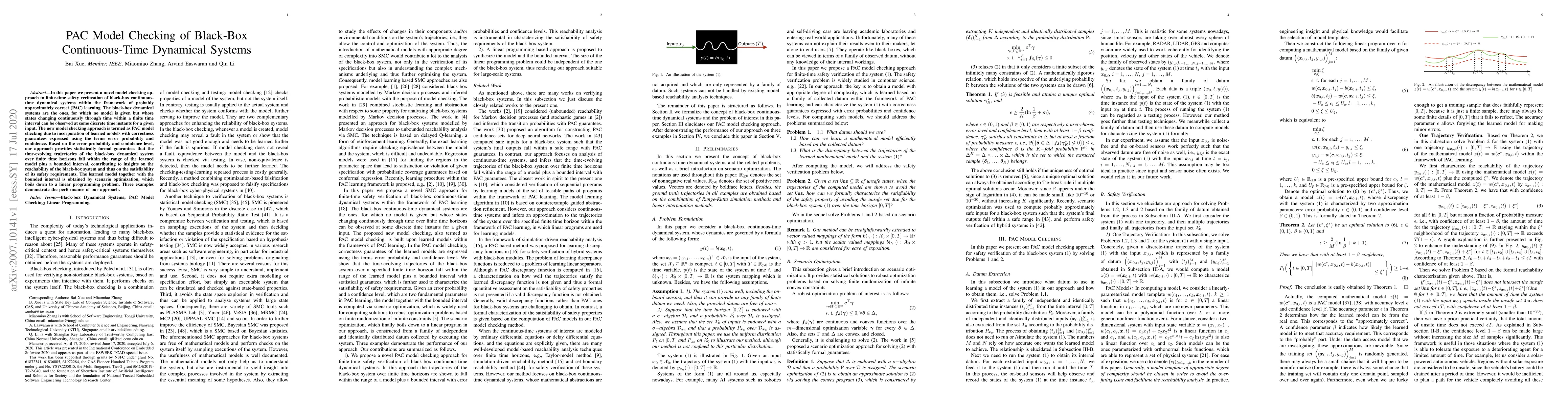 This paper introduces a novel PAC model checking method for verifying finite-time safety in black-box continuous-time dynamical systems, providing statistical guarantees on system trajectories through learned models and optimization techniques. The method ensures the system's behavior within a bounded interval, aiding in safety requirement satisfaction.