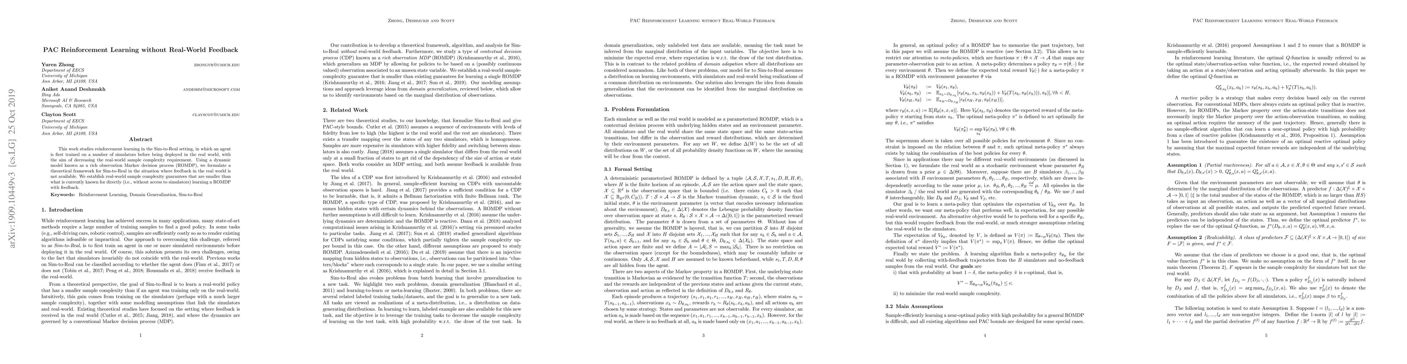 This paper develops a theoretical framework for reinforcement learning in the Sim-to-Real setting without real-world feedback, achieving lower real-world sample complexity compared to direct learning methods. The approach leverages a rich observation Markov decision process (ROMDP) and simulator training to enhance performance.