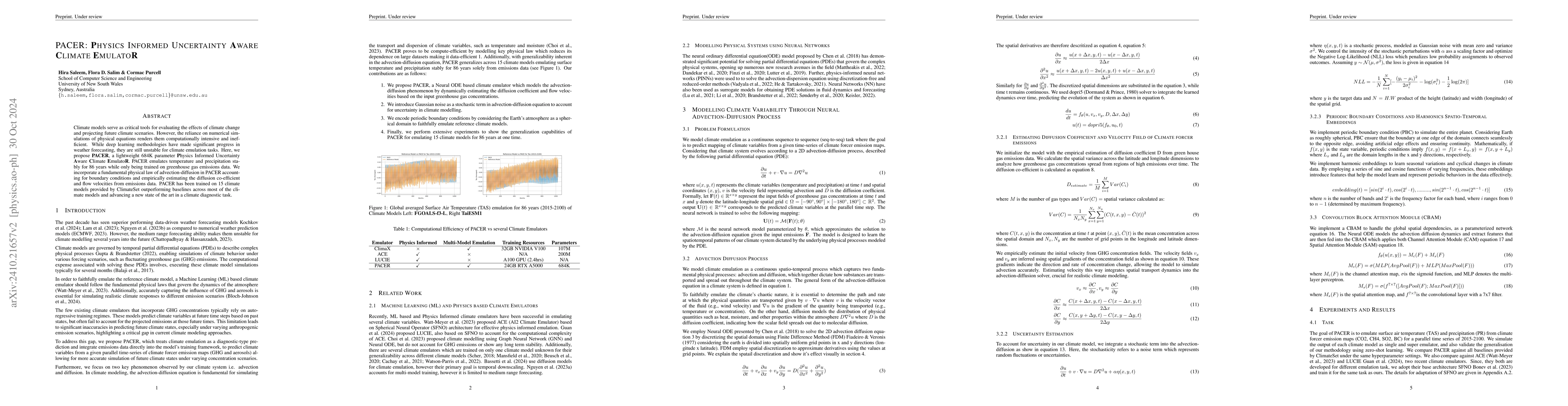 Climate models serve as critical tools for evaluating the effects of climate change and projecting future climate scenarios. However, the reliance on numerical simulations of physical equations renders them computationally intensive and inefficient. While deep learning methodologies have made significant progress in weather forecasting, they are still unstable for climate emulation tasks. Here, we propose PACE, a lightweight 684K parameter Physics Informed Uncertainty Aware Climate Emulator. PACE emulates temperature and precipitation stably for 86 years while only being trained on greenhouse gas emissions data. We incorporate a fundamental physical law of advection-diffusion in PACE accounting for boundary conditions and empirically estimating the diffusion co-efficient and flow velocities from emissions data. PACE has been trained on 15 climate models provided by ClimateSet outperforming baselines across most of the climate models and advancing a new state of the art in a climate diagnostic task.