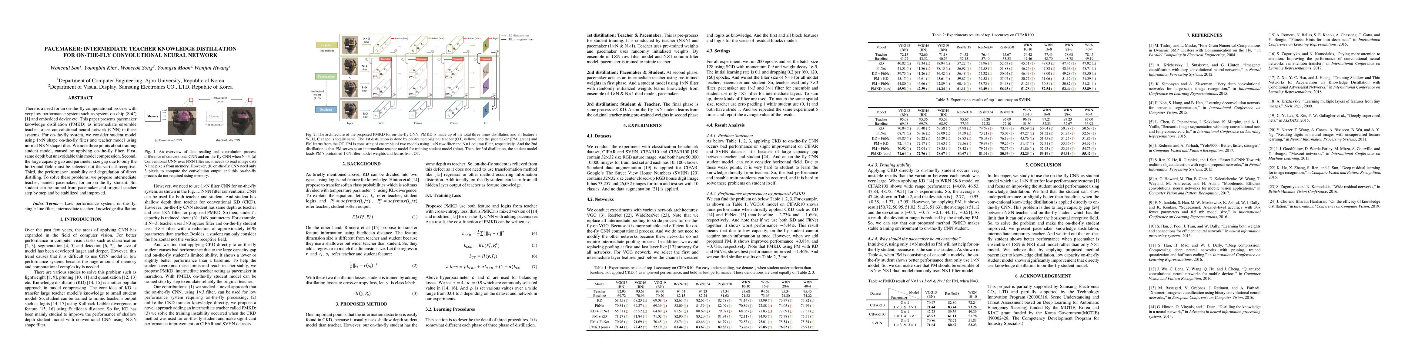 There is a need for an on-the-fly computational process with very low performance system such as system-on-chip (SoC) and embedded device etc. This paper presents pacemaker knowledge distillation as intermediate ensemble teacher to use convolutional neural network in these systems. For on-the-fly system, we consider student model using 1xN shape on-the-fly filter and teacher model using normal NxN shape filter. We note three points about training student model, caused by applying on-the-fly filter. First, same depth but unavoidable thin model compression. Second, the large capacity gap and parameter size gap due to only the horizontal field must be selected not the vertical receptive. Third, the performance instability and degradation of direct distilling. To solve these problems, we propose intermediate teacher, named pacemaker, for an on-the-fly student. So, student can be trained from pacemaker and original teacher step by step. Experiments prove our proposed method make significant performance (accuracy) improvements: on CIFAR100, 5.39% increased in WRN-40-4 than conventional knowledge distillation which shows even low performance than baseline. And we solve train instability, occurred when conventional knowledge distillation was applied without proposed method, by reducing deviation range by applying proposed method pacemaker knowledge distillation.