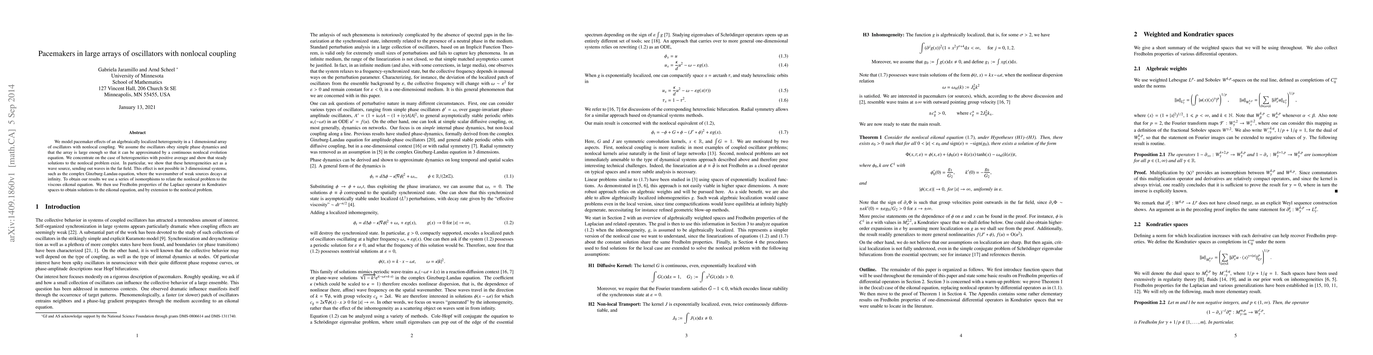 We model pacemaker effects of an algebraically localized heterogeneity in a 1 dimensional array of oscillators with nonlocal coupling. We assume the oscillators obey simple phase dynamics and that the array is large enough so that it can be approximated by a continuous nonlocal evolution equation. We concentrate on the case of heterogeneities with positive average and show that steady solutions to the nonlocal problem exist. In particular, we show that these heterogeneities act as a wave source, sending out waves in the far field. This effect is not possible in 3 dimensional systems, such as the complex Ginzburg-Landau equation, where the wavenumber of weak sources decays at infinity. To obtain our results we use a series of isomorphisms to relate the nonlocal problem to the viscous eikonal equation. We then use Fredholm properties of the Laplace operator in Kondratiev spaces to obtain solutions to the eikonal equation, and by extension to the nonlocal problem.