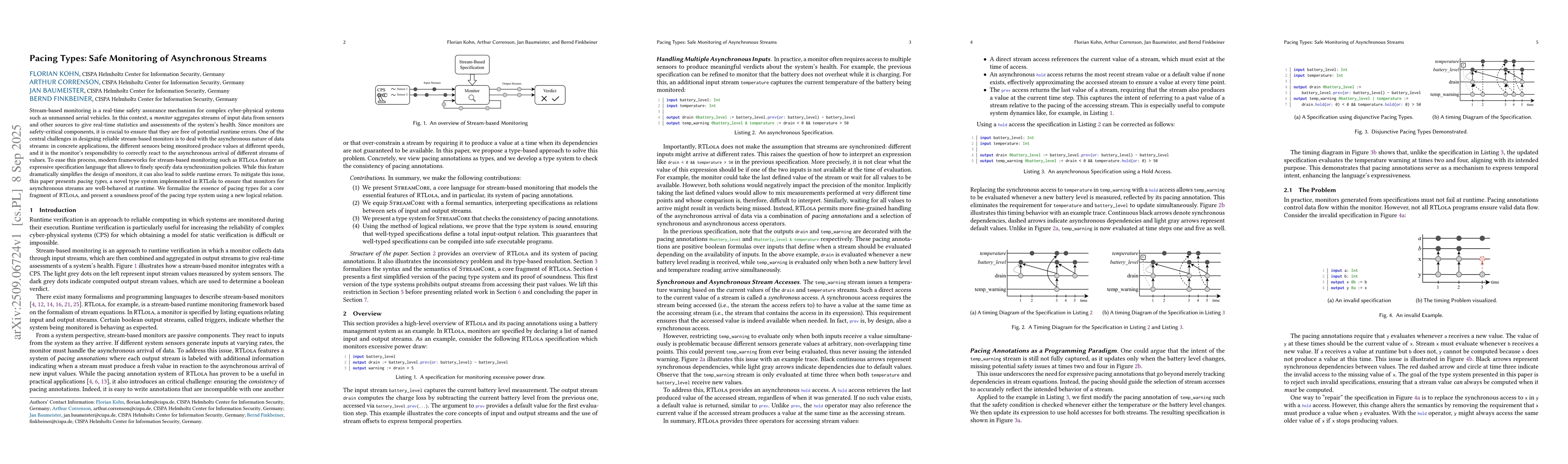 Stream-based monitoring is a real-time safety assurance mechanism for complex cyber-physical systems such as unmanned aerial vehicles. In this context, a monitor aggregates streams of input data from sensors and other sources to give real-time statistics and assessments of the system's health. Since monitors are safety-critical components, it is crucial to ensure that they are free of potential runtime errors. One of the central challenges in designing reliable stream-based monitors is to deal with the asynchronous nature of data streams: in concrete applications, the different sensors being monitored produce values at different speeds, and it is the monitor's responsibility to correctly react to the asynchronous arrival of different streams of values. To ease this process, modern frameworks for stream-based monitoring such as RTLola feature an expressive specification language that allows to finely specify data synchronization policies. While this feature dramatically simplifies the design of monitors, it can also lead to subtle runtime errors. To mitigate this issue, this paper presents pacing types, a novel type system implemented in RTLola to ensure that monitors for asynchronous streams are well-behaved at runtime. We formalize the essence of pacing types for a core fragment of RTLola, and present a soundness proof of the pacing type system using a new logical relation.
