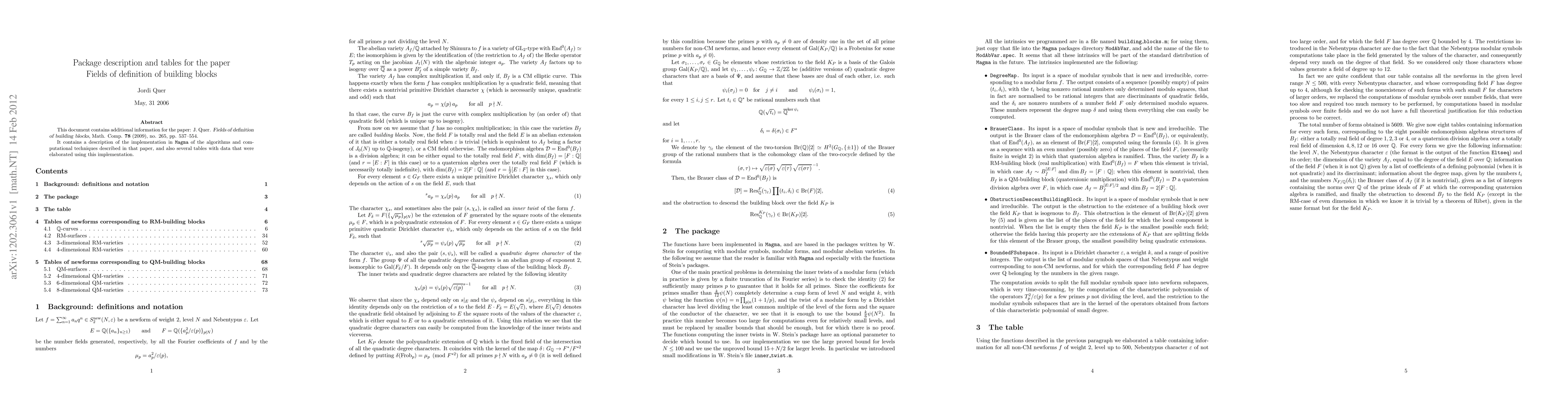 This document contains additional information for the paper: J. Quer. Fields of definition of building blocks, Math. Comp. 78 (2009), no. 265, pp. 537--554. It contains a description of the implementation in Magma of the algorithms and computational techniques described in that paper, and also several tables with data that were elaborated using this implementation.