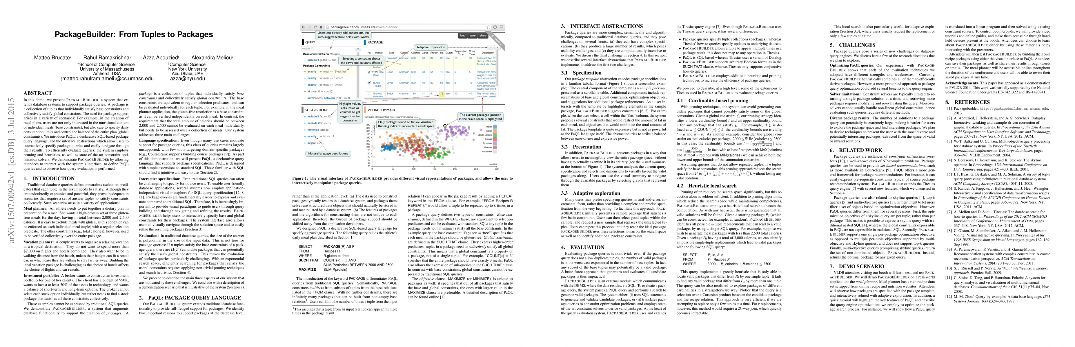 In this demo, we present PackageBuilder, a system that extends database systems to support package queries. A package is a collection of tuples that individually satisfy base constraints and collectively satisfy global constraints. The need for package support arises in a variety of scenarios: For example, in the creation of meal plans, users are not only interested in the nutritional content of individual meals (base constraints), but also care to specify daily consumption limits and control the balance of the entire plan (global constraints). We introduce PaQL, a declarative SQL-based package query language, and the interface abstractions which allow users to interactively specify package queries and easily navigate through their results. To efficiently evaluate queries, the system employs pruning and heuristics, as well as state-of-the-art constraint optimization solvers. We demonstrate PackageBuilder by allowing attendees to interact with the system's interface, to define PaQL queries and to observe how query evaluation is performed.