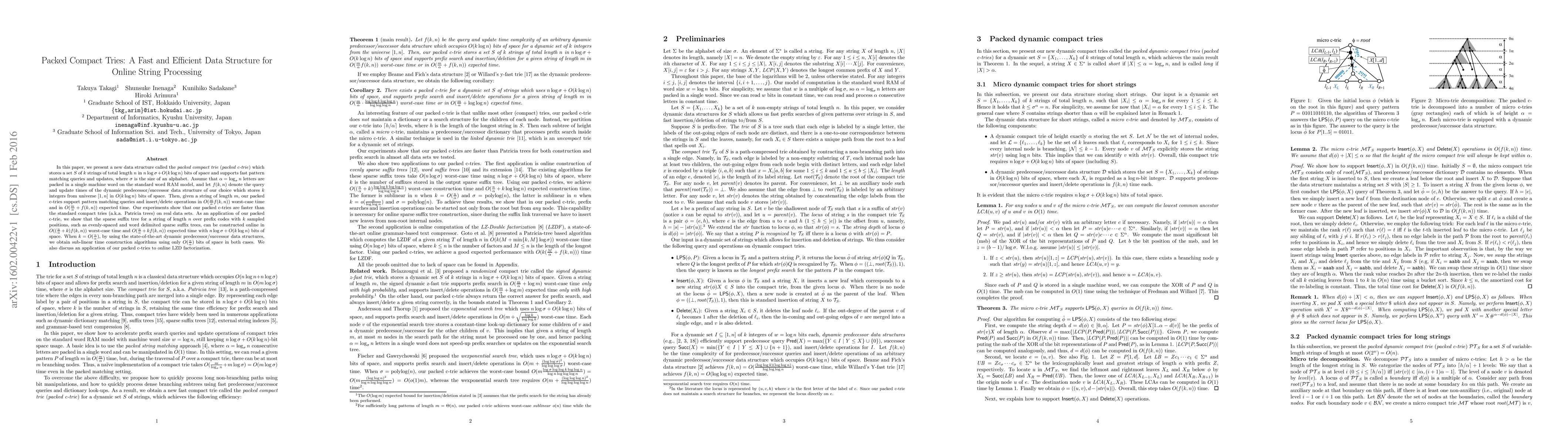 The packed c-trie data structure, which efficiently combines compact tries with dynamic predecessor/successor data structures for online string processing.