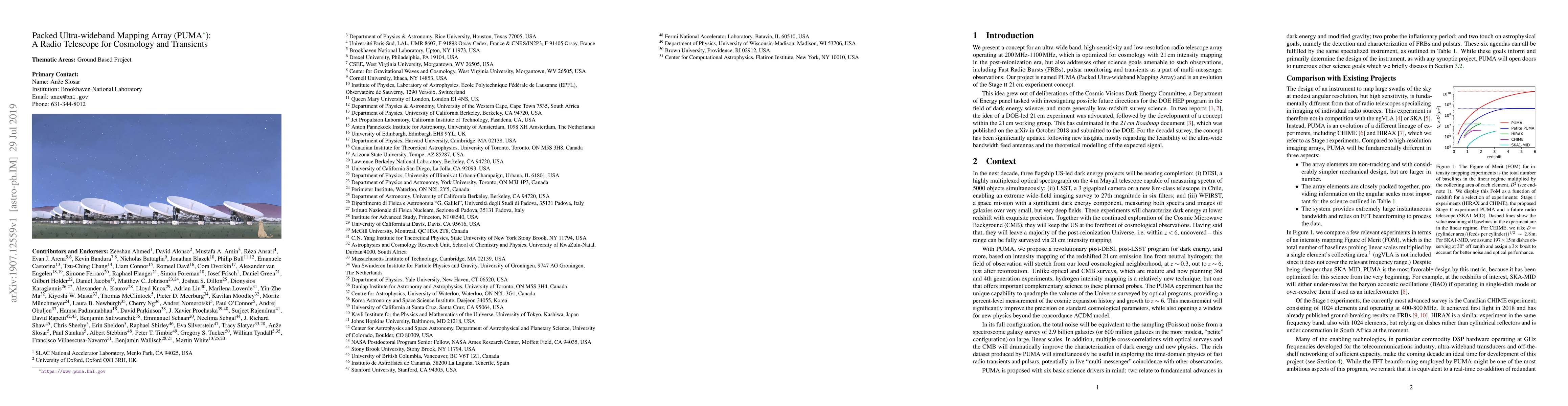 PUMA is a proposal for an ultra-wideband, low-resolution and transit interferometric radio telescope operating at $200-1100\,\mathrm{MHz}$. Its design is driven by six science goals which span three science themes: the physics of dark energy (measuring the expansion history and growth of the universe up to $z=6$), the physics of inflation (constraining primordial non-Gaussianity and primordial features) and the transient radio sky (detecting one million fast radio bursts and following up SKA-discovered pulsars). We propose two array configurations composed of hexagonally close-packed 6m dish arrangements with 50% fill factor. The initial 5,000 element 'petite array' is scientifically compelling, and can act as a demonstrator and a stepping stone to the full 32,000 element 'full array'. Viewed as a 21cm intensity mapping telescope, the program has the noise equivalent of a traditional spectroscopic galaxy survey comprised of 0.6 and 2.5 billion galaxies at a comoving wavenumber of $k=0.5\,h\mathrm{Mpc}^{-1}$ spanning the redshift range $z = 0.3 - 6$ for the petite and full configurations, respectively. At redshifts beyond $z=2$, the 21cm technique is a uniquely powerful way of mapping the universe, while the low-redshift range will allow for numerous cross-correlations with existing and upcoming surveys. This program is enabled by the development of ultra-wideband radio feeds, cost-effective dish construction methods, commodity radio-frequency electronics driven by the telecommunication industry and the emergence of sufficient computing power to facilitate real-time signal processing that exploits the full potential of massive radio arrays. The project has an estimated construction cost of 55 and 330 million FY19 USD for the petite and full array configurations. Including R&D, design, operations and science analysis, the cost rises to 125 and 600 million FY19 USD, respectively.