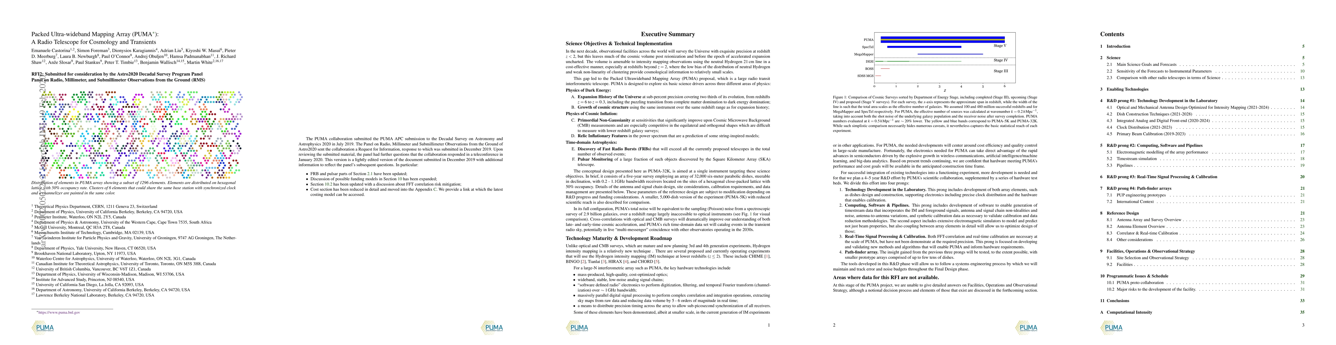 The Packed Ultra-wideband Mapping Array (PUMA) is a proposed low-resolution transit interferometric radio telescope operating over the frequency range 200 - 1100MHz. Its rich science portfolio will include measuring structure in the universe from redshift z = 0.3 to 6 using 21cm intensity mapping, detecting one million fast radio bursts, and monitoring thousands of pulsars. It will allow PUMA to advance science in three different areas of physics (the physics of dark energy, the physics of cosmic inflation and time-domain astrophysics). This document is a response to a request for information (RFI) by the Panel on Radio, Millimeter, and Submillimeter Observations from the Ground (RMS) of the Decadal Survey on Astronomy and Astrophysics 2020. We present the science case of PUMA, the development path and major risks to the project.
