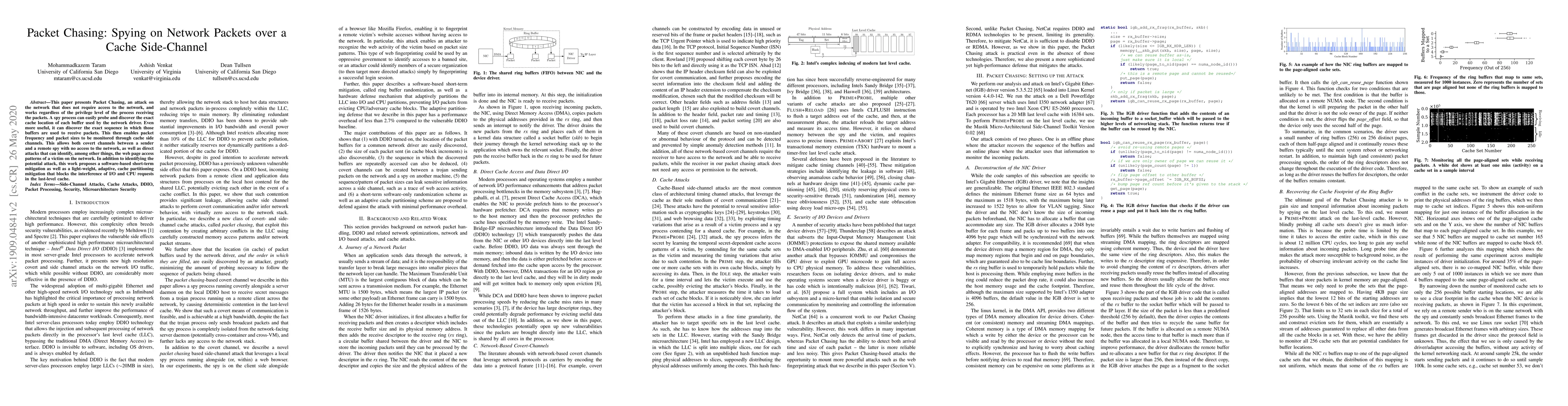 This paper presents Packet Chasing, an attack on the network that does not require access to the network, and works regardless of the privilege level of the process receiving the packets. A spy process can easily probe and discover the exact cache location of each buffer used by the network driver. Even more useful, it can discover the exact sequence in which those buffers are used to receive packets. This then enables packet frequency and packet sizes to be monitored through cache side channels. This allows both covert channels between a sender and a remote spy with no access to the network, as well as direct attacks that can identify, among other things, the web page access patterns of a victim on the network. In addition to identifying the potential attack, this work proposes a software-based short-term mitigation as well as a light-weight, adaptive, cache partitioning mitigation that blocks the interference of I/O and CPU requests in the last-level cache.