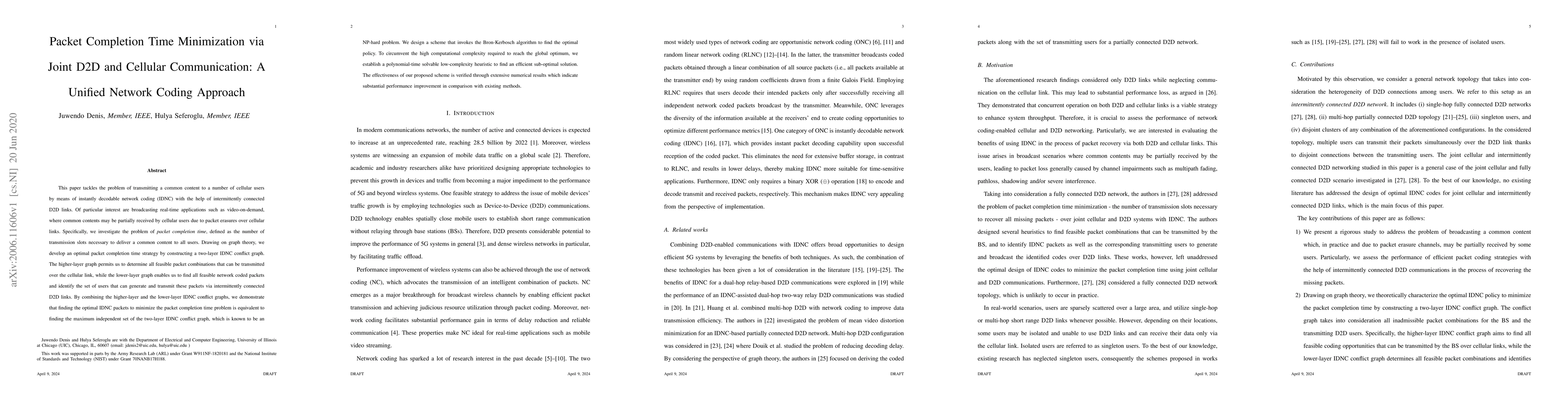 This paper tackles the problem of transmitting a common content to a number of cellular users by means of instantly decodable network coding (IDNC) with the help of intermittently connected D2D links. Of particular interest are broadcasting real-time applications such as video-on-demand, where common contents may be partially received by cellular users due to packet erasures over cellular links. Specifically, we investigate the problem of packet completion time, defined as the number of transmission slots necessary to deliver a common content to all users. Drawing on graph theory, we develop an optimal packet completion time strategy by constructing a two-layer IDNC conflict graph. The higher-layer graph permits us to determine all feasible packet combinations that can be transmitted over the cellular link, while the lower-layer graph enables us to find all feasible network coded packets and identify the set of users that can generate and transmit these packets via intermittently connected D2D links. By combining the higher-layer and the lower-layer IDNC conflict graphs, we demonstrate that finding the optimal IDNC packets to minimize the packet completion time problem is equivalent to finding the maximum independent set of the two-layer IDNC conflict graph, which is known to be an NP-hard problem. We design a scheme that invokes the Bron-Kerbosch algorithm to find the optimal policy. To circumvent the high computational complexity required to reach the global optimum, we establish a polynomial-time solvable low-complexity heuristic to find an efficient sub-optimal solution. The effectiveness of our proposed scheme is verified through extensive numerical results which indicate substantial performance improvement in comparison with existing methods.