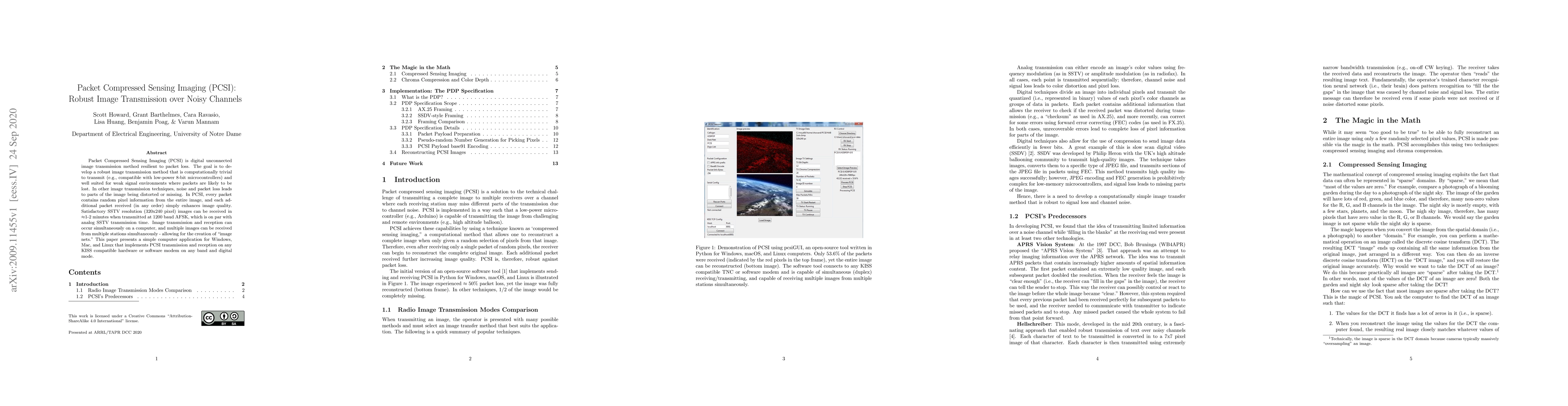 Packet Compressed Sensing Imaging (PCSI) is digital unconnected image transmission method resilient to packet loss. The goal is to develop a robust image transmission method that is computationally trivial to transmit (e.g., compatible with low-power 8-bit microcontrollers) and well suited for weak signal environments where packets are likely to be lost. In other image transmission techniques, noise and packet loss leads to parts of the image being distorted or missing. In PCSI, every packet contains random pixel information from the entire image, and each additional packet received (in any order) simply enhances image quality. Satisfactory SSTV resolution (320x240 pixel) images can be received in ~1-2 minutes when transmitted at 1200 baud AFSK, which is on par with analog SSTV transmission time. Image transmission and reception can occur simultaneously on a computer, and multiple images can be received from multiple stations simultaneously - allowing for the creation of "image nets." This paper presents a simple computer application for Windows, Mac, and Linux that implements PCSI transmission and reception on any KISS compatible hardware or software modem on any band and digital mode.