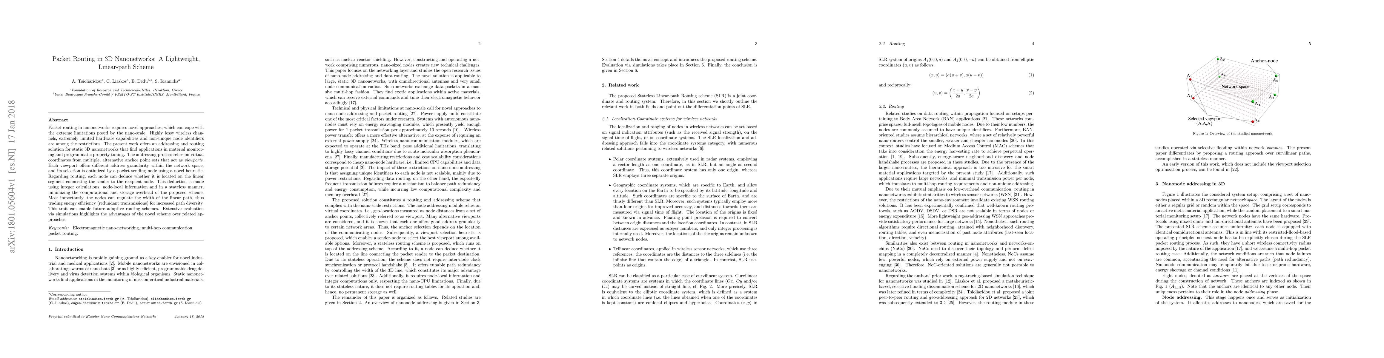 Packet routing in nanonetworks requires novel approaches, which can cope with the extreme limitations posed by the nano-scale. Highly lossy wireless channels, extremely limited hardware capabilities and non-unique node identifiers are among the restrictions. The present work offers an addressing and routing solution for static 3D nanonetworks that find applications in material monitoring and programmatic property tuning. The addressing process relies on virtual coordinates from multiple, alternative anchor point sets that act as \emph{viewports}. Each viewport offers different address granularity within the network space, and its selection is optimized by a packet sending node using a novel heuristic. Regarding routing, each node can deduce whether it is located on the linear segment connecting the sender to the recipient node. This deduction is made using integer calculations, node-local information and in a stateless manner, minimizing the computational and storage overhead of the proposed scheme. Most importantly, the nodes can regulate the width of the linear path, thus trading energy efficiency (redundant transmissions) for increased path diversity. This trait can enable future adaptive routing schemes. Extensive evaluation via simulations highlights the advantages of the novel scheme over related approaches.