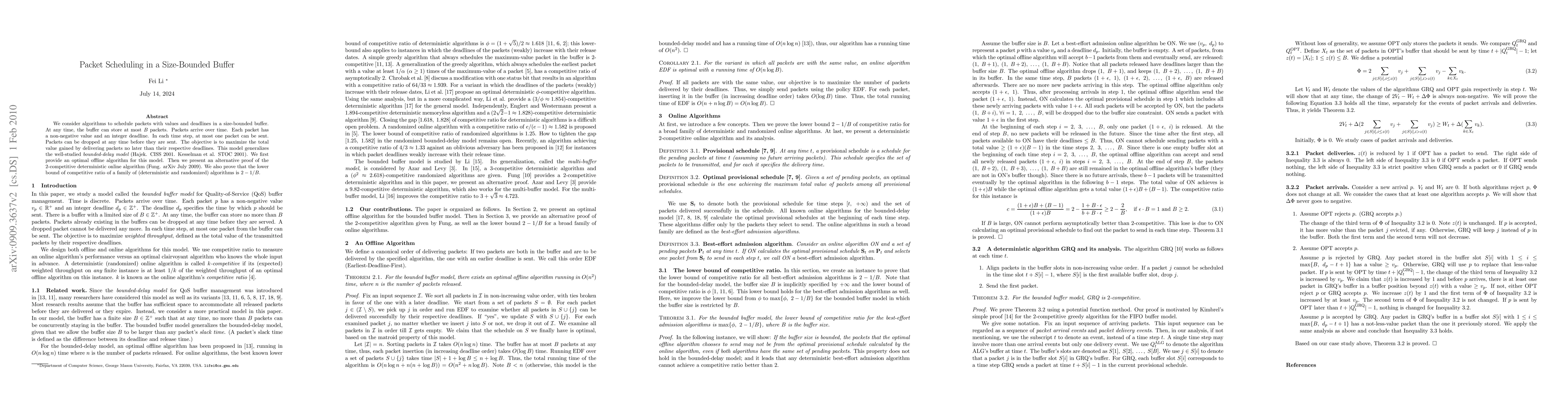 This paper explores packet scheduling algorithms for a size-bounded buffer where packets have values and deadlines. It proposes an optimal offline algorithm and provides a new proof for a 2-competitive online algorithm, while establishing a lower bound of 2 - 1/B for the competitive ratio of any algorithm in this model.
