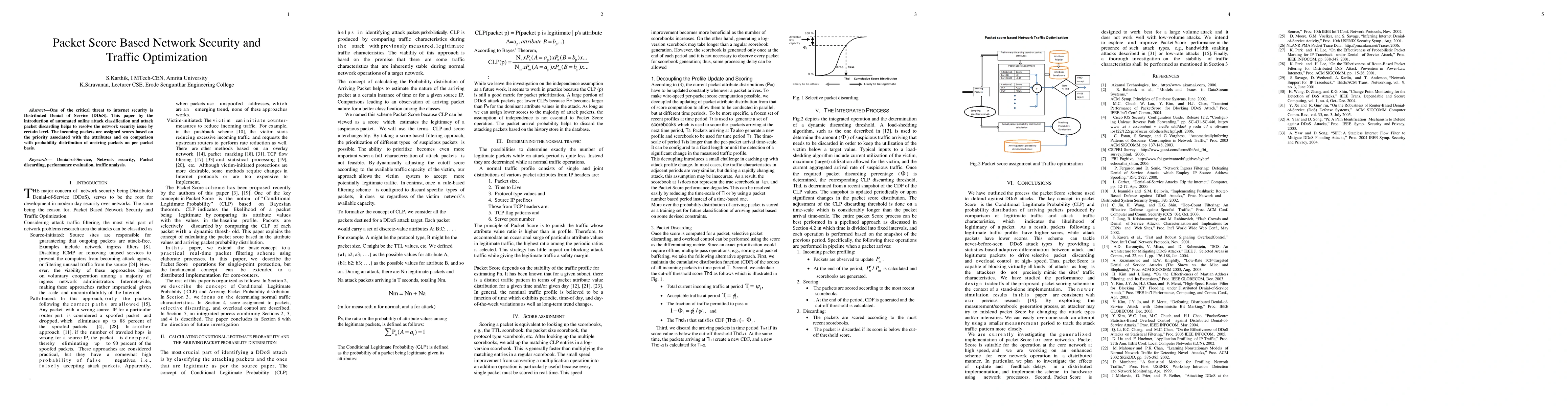 One of the critical threat to internet security is Distributed Denial of Service (DDoS). This paper by the introduction of automated online attack classification and attack packet discarding helps to resolve the network security issue by certain level. The incoming packets are assigned scores based on the priority associated with the attributes and on comparison with probability distribution of arriving packets on per packet basis.
