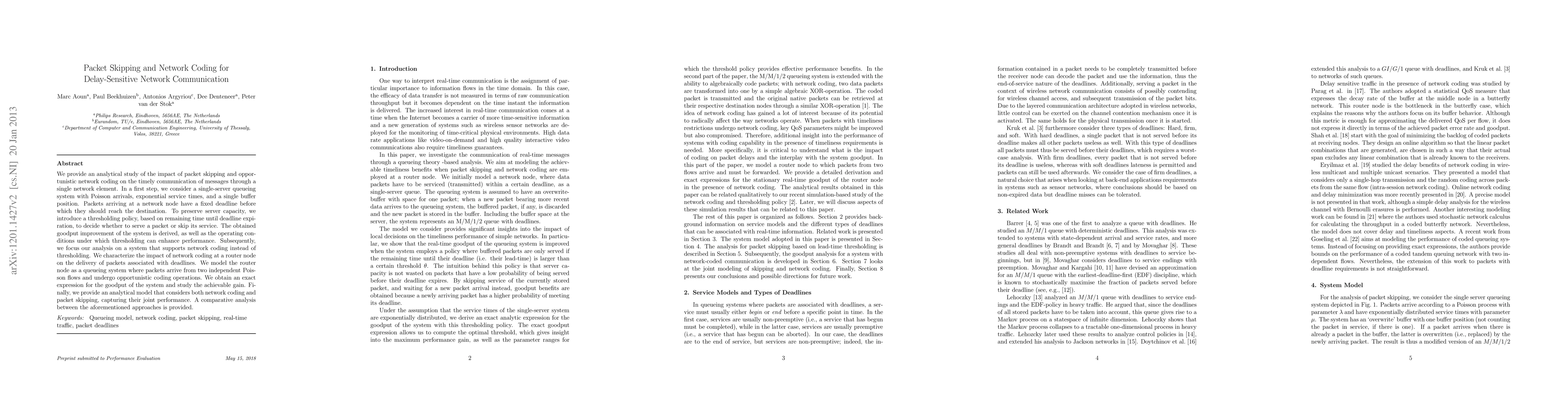 This paper analyzes the use of packet skipping and opportunistic network coding to improve timely message delivery in delay-sensitive network communication. It derives performance metrics and compares the effectiveness of thresholding policies versus network coding in a single-server queueing system with packet deadlines.