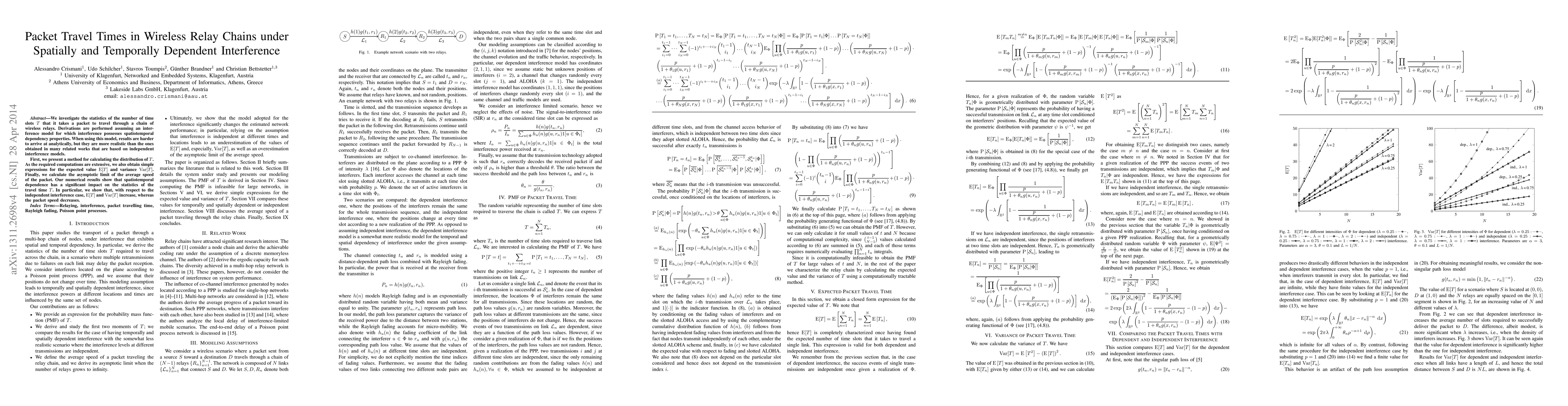 We investigate the statistics of the number of time slots $T$ that it takes a packet to travel through a chain of wireless relays. Derivations are performed assuming an interference model for which interference possesses spatiotemporal dependency properties. When using this model, results are harder to arrive at analytically, but they are more realistic than the ones obtained in many related works that are based on independent interference models. First, we present a method for calculating the distribution of $T$. As the required computations are extensive, we also obtain simple expressions for the expected value $\mathrm{E} [T]$ and variance $\mathrm{var} [T]$. Finally, we calculate the asymptotic limit of the average speed of the packet. Our numerical results show that spatiotemporal dependence has a significant impact on the statistics of the travel time $T$. In particular, we show that, with respect to the independent interference case, $\mathrm{E} [T]$ and $\mathrm{var} [T]$ increase, whereas the packet speed decreases.