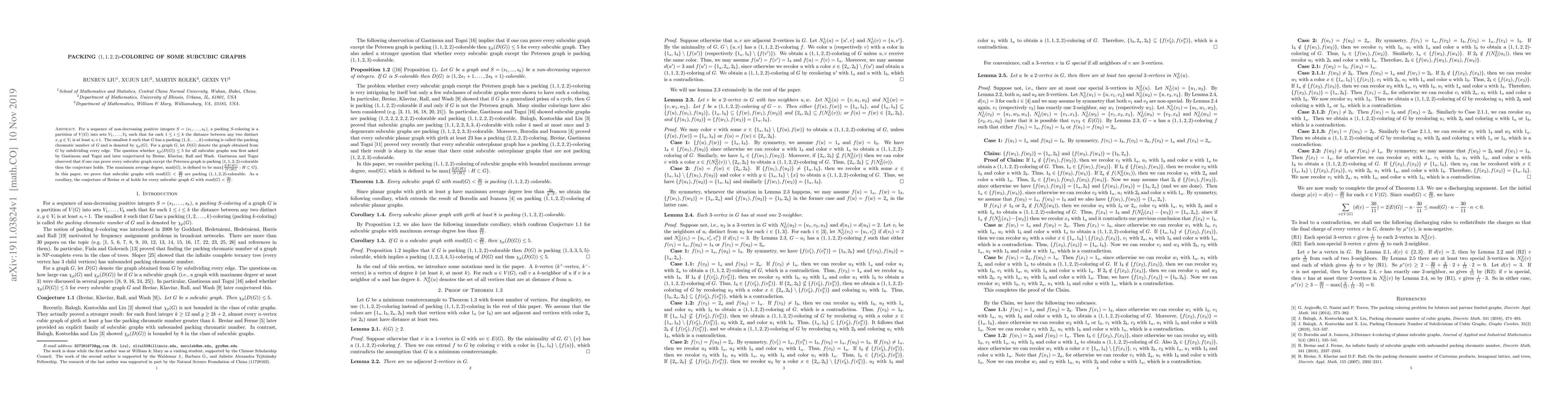 For a sequence of non-decreasing positive integers $S = (s_1, \ldots, s_k)$, a packing $S$-coloring is a partition of $V(G)$ into sets $V_1, \ldots, V_k$ such that for each $1\leq i \leq k$ the distance between any two distinct $x,y\in V_i$ is at least $s_i+1$. The smallest $k$ such that $G$ has a packing $(1,2, \ldots, k)$-coloring is called the packing chromatic number of $G$ and is denoted by $\chi_p(G)$. For a graph $G$, let $D(G)$ denote the graph obtained from $G$ by subdividing every edge. The question whether $\chi_p(D(G)) \le 5$ for all subcubic graphs was first asked by Gastineau and Togni and later conjectured by Bresar, Klavzar, Rall and Wash. Gastineau and Togni observed that if one can prove every subcubic graph except the Petersen graph is packing $(1,1,2,2)$-colorable then the conjecture holds. The maximum average degree, mad($G$), is defined to be $\max\{\frac{2|E(H)|}{|V(H)|}: H \subset G\}$. In this paper, we prove that subcubic graphs with $mad(G)<\frac{30}{11}$ are packing $(1,1,2,2)$-colorable. As a corollary, the conjecture of Bresar et al holds for every subcubic graph $G$ with $mad(G)<\frac{30}{11}$.