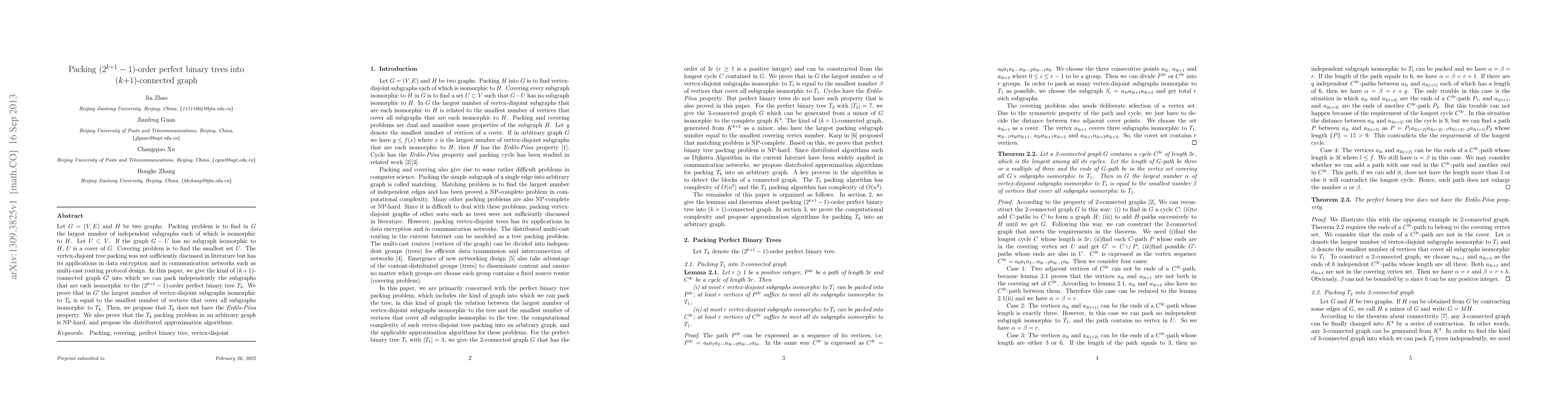 This paper explores the packing of vertex-disjoint subgraphs isomorphic to $(2^{k+1}-1)$-order perfect binary trees ($T_k$) into $(k+1)$-connected graphs ($G'$). The study proves that the largest number of such $T_k$ subgraphs equals the smallest set of vertices that cover all $T_k$ subgraphs in $G'$, suggesting $T_k$ lacks the Erdős-Pósa property. It also confirms the NP-hardness of the $T_k$ packing problem in arbitrary graphs and proposes distributed approximation algorithms.