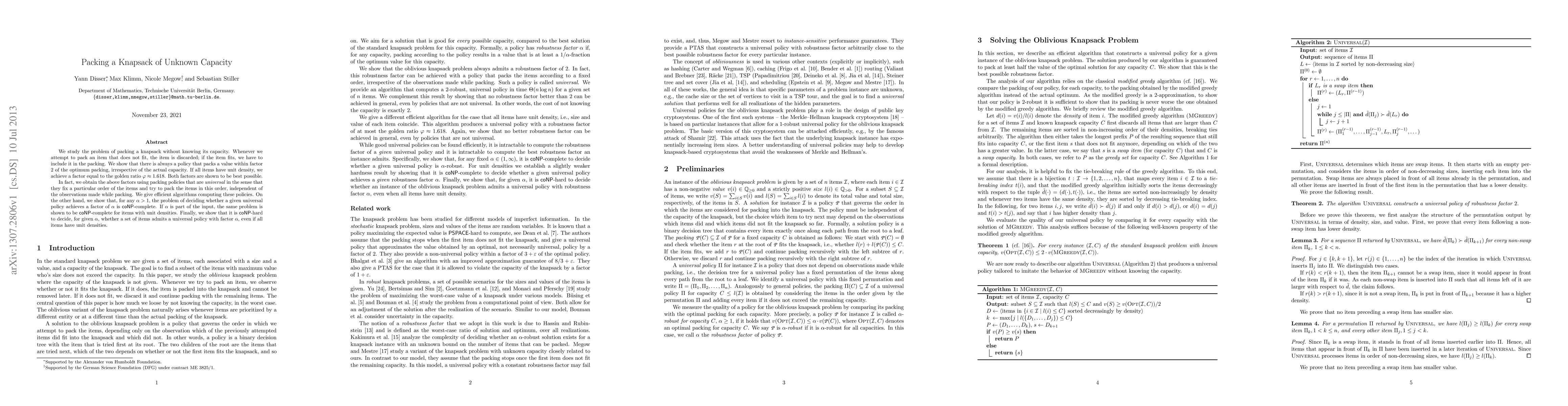 This paper addresses the knapsack problem where the capacity is unknown, proposing universal packing policies that achieve a factor 2 or the golden ratio of the optimal packing value. The study also proves the computational complexity of determining the effectiveness of such policies.