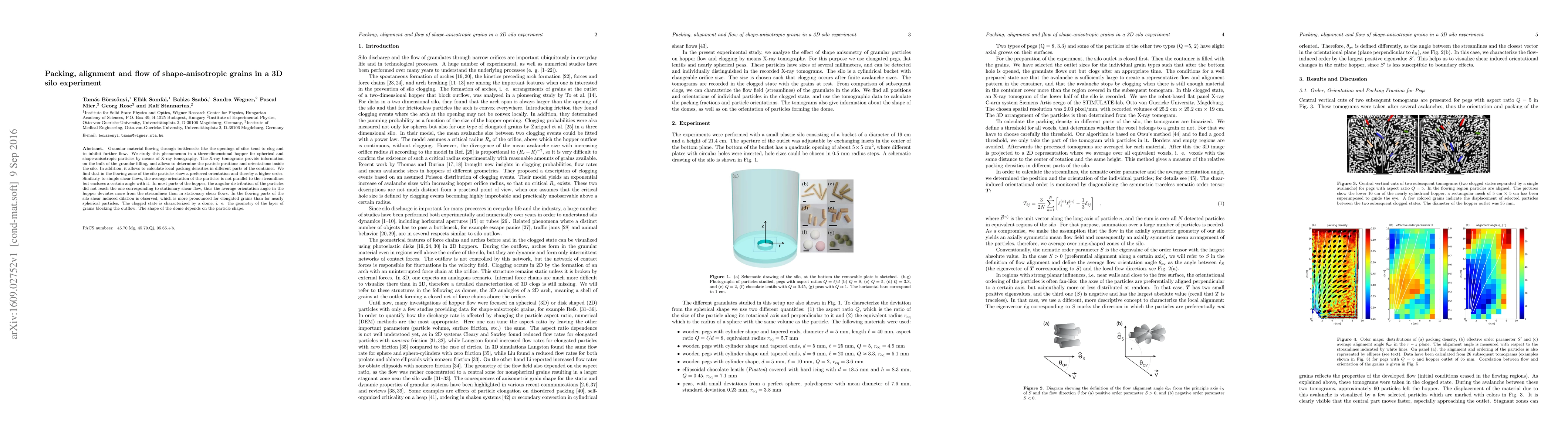 Granular material flowing through bottlenecks like the openings of silos tend to clog and to inhibit further flow. We study this phenomenon in a three-dimensional hopper for spherical and shape-anisotropic particles by means of X-ray tomography. The X-ray tomograms provide information on the bulk of the granular filling, and allows to determine the particle positions and orientations inside the silo. In addition, it allows to calculate local packing densities in different parts of the container. We find that in the flowing zone of the silo particles show a preferred orientation and thereby a higher order. Similarly to simple shear flows, the average orientation of the particles is not parallel to the streamlines but encloses a certain angle with it. In most parts of the hopper, the angular distribution of the particles did not reach the one corresponding to stationary shear flow, thus the average orientation angle in the hopper deviates more from the streamlines than in stationary shear flows. In the flowing parts of the silo shear induced dilation is observed, which is more pronounced for elongated grains than for nearly spherical particles. The clogged state is characterized by a dome, i. e. the geometry of the layer of grains blocking the outflow. The shape of the dome depends on the particle shape.