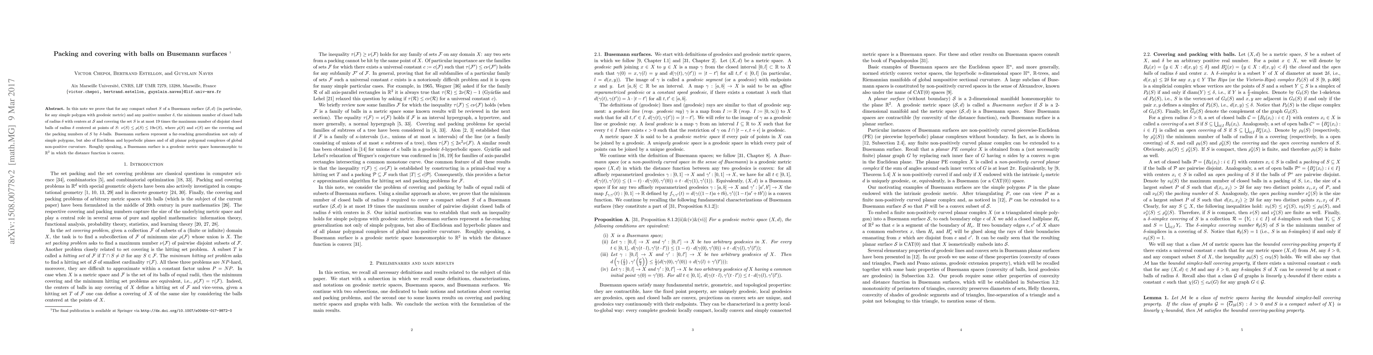 In this note we prove that for any compact subset $S$ of a Busemann surface $({\mathcal S},d)$ (in particular, for any simple polygon with geodesic metric) and any positive number $\delta$, the minimum number of closed balls of radius $\delta$ with centers at $\mathcal S$ and covering the set $S$ is at most 19 times the maximum number of disjoint closed balls of radius $\delta$ centered at points of $S$: $\nu(S) \le \rho(S) \le 19\nu(S)$, where $\rho(S)$ and $\nu(S)$ are the covering and the packing numbers of $S$ by ${\delta}$-balls.
