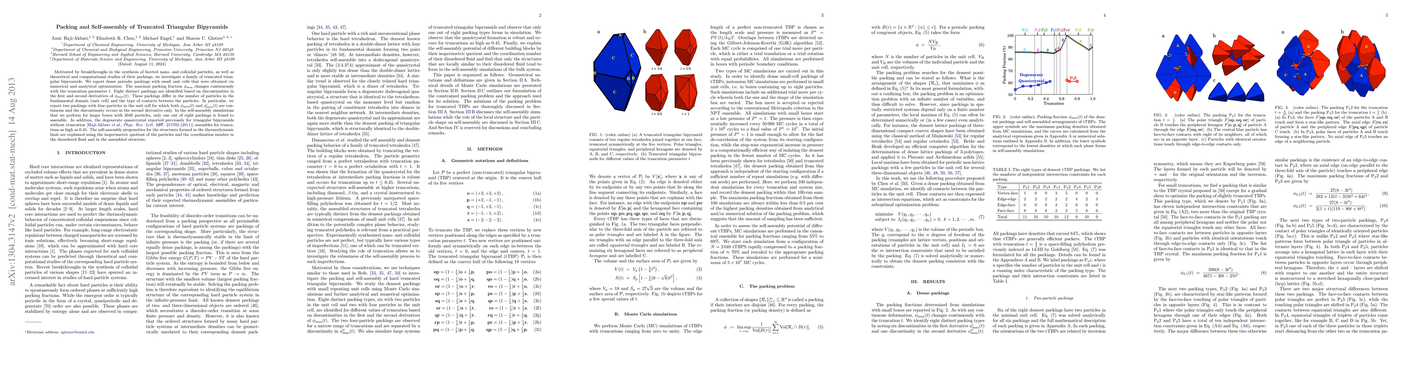 This research identifies dense periodic packings of truncated triangular bipyramids, with maximal packing fraction changing continuously with truncation. Eight distinct packings are found, differing in particle count and contact types, with two having four particles per unit cell. Self-assembly simulations reveal only one of these packings forms in larger systems, while a degenerate quasicrystal assembles for high truncations. The study explains self-assembly propensities using isoperimetric quotient and coordination number.