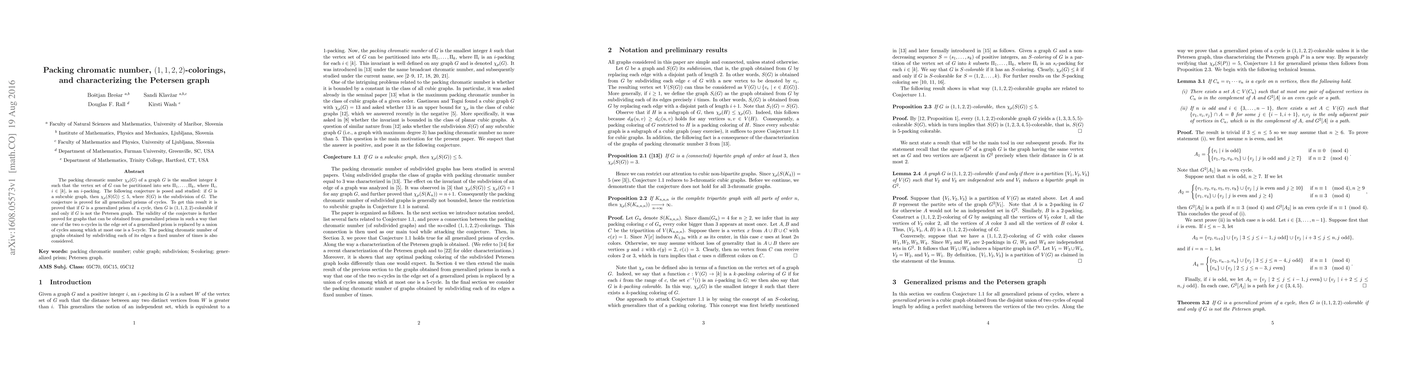 This paper investigates the packing chromatic number $\chi_{\rho}(G)$ and proves a conjecture regarding subcubic graphs, specifically showing $\chi_{\rho}(S(G))\le 5$ for generalized prisms of cycles. It also characterizes $(1,1,2,2)$-colorings, proving that generalized prisms of cycles are not the Petersen graph.