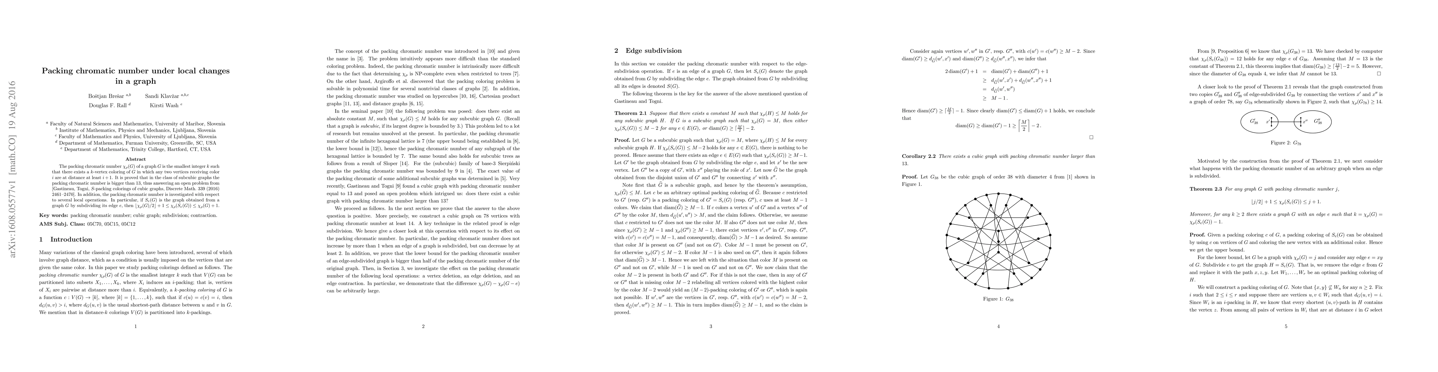 The paper establishes that the packing chromatic number $\chi_{\rho}(G)$ for subcubic graphs is greater than 13, resolving an open question. It also examines how this number changes under local operations like edge subdivision, showing $\left\lfloor \chi_{\rho}(G)/2 \right\rfloor +1 \le \chi_{\rho}(S_e(G)) \le \chi_{\rho}(G)+1$.