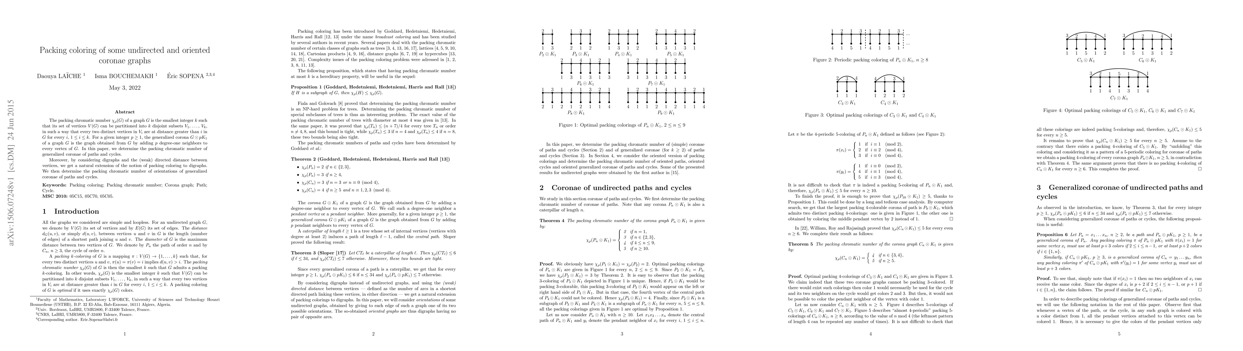 The packing chromatic number $\pcn(G)$ of a graph $G$ is the smallest integer $k$ such that its set of vertices $V(G)$ can be partitioned into $k$ disjoint subsets $V\_1$, \ldots, $V\_k$, in such a way that every two distinct vertices in $V\_i$ are at distance greater than $i$ in $G$ for every $i$, $1\le i\le k$. For a given integer $p \ge 1$, the generalized corona $G\odot pK\_1$ of a graph $G$ is the graph obtained from $G$ by adding $p$ degree-one neighbors to every vertex of $G$. In this paper, we determine the packing chromatic number of generalized coronae of paths and cycles. Moreover, by considering digraphs and the (weak) directed distance between vertices, we get a natural extension of the notion of packing coloring to digraphs. We then determine the packing chromatic number of orientations of generalized coronae of paths and cycles.