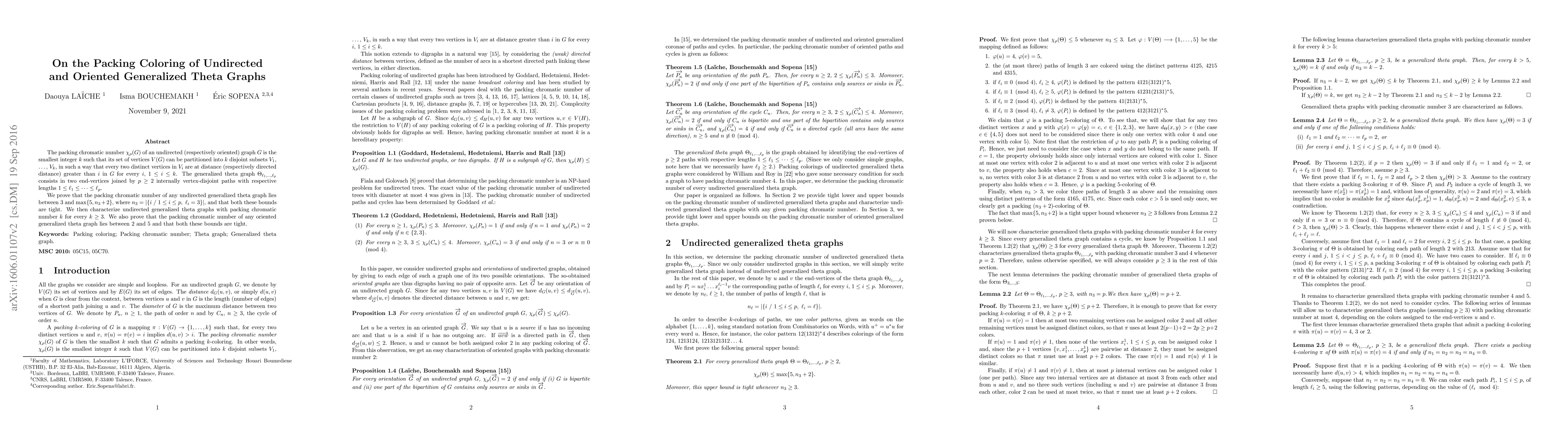 The paper presents detailed proofs and lemmas characterizing packing colorings of generalized theta graphs, both undirected and oriented, providing tight bounds and conditions.