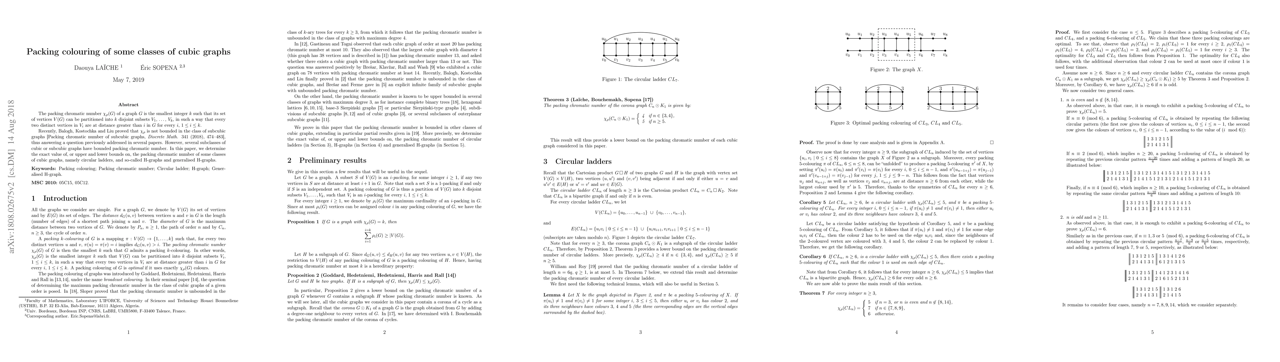 The packing chromatic number $\chi$ $\rho$ (G) of a graph G is the smallest integer k such that its set of vertices V (G) can be partitioned into k disjoint subsets V 1 ,. .. , V k , in such a way that every two distinct vertices in V i are at distance greater than i in G for every i, 1 $\le$ i $\le$ k. Recently, Balogh, Kostochka and Liu proved that $\chi$ $\rho$ is not bounded in the class of subcubic graphs [Packing chromatic number of subcubic graphs, Discrete Math. 341 (2018), 474483], thus answering a question previously addressed in several papers. However, several subclasses of cubic or subcubic graphs have bounded packing chromatic number. In this paper, we determine the exact value of, or upper and lower bounds on, the packing chromatic number of some classes of cubic graphs, namely circular ladders, and so-called H-graphs and generalised H-graphs.