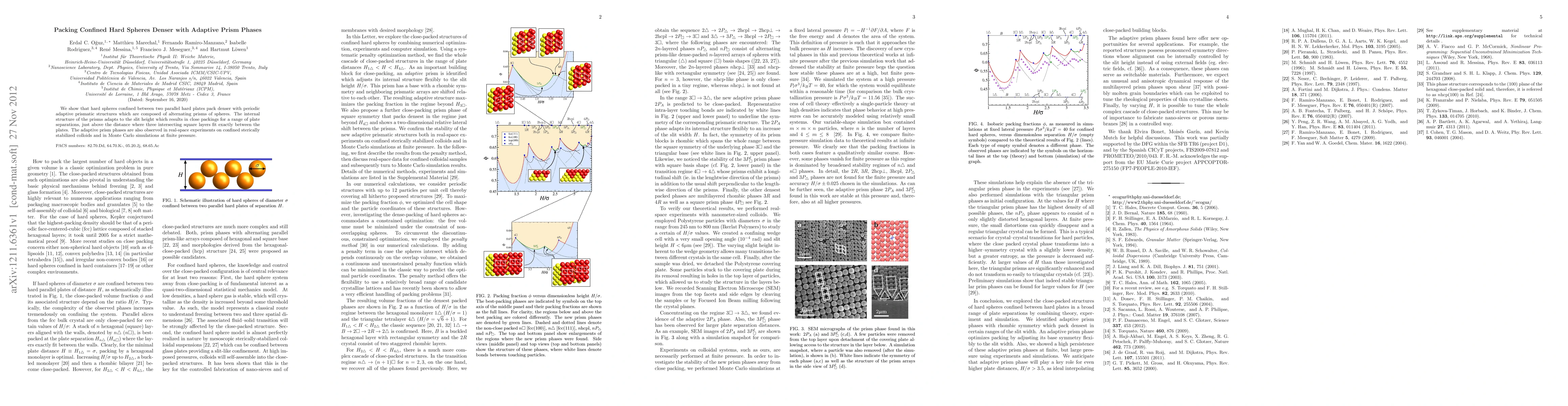 This paper demonstrates that adaptive prismatic structures composed of alternating spheres can enable denser packing of hard spheres between two parallel plates. These prisms adjust to the slit height, achieving close packings for various plate separations, and are observed in both experimental and simulation studies.
