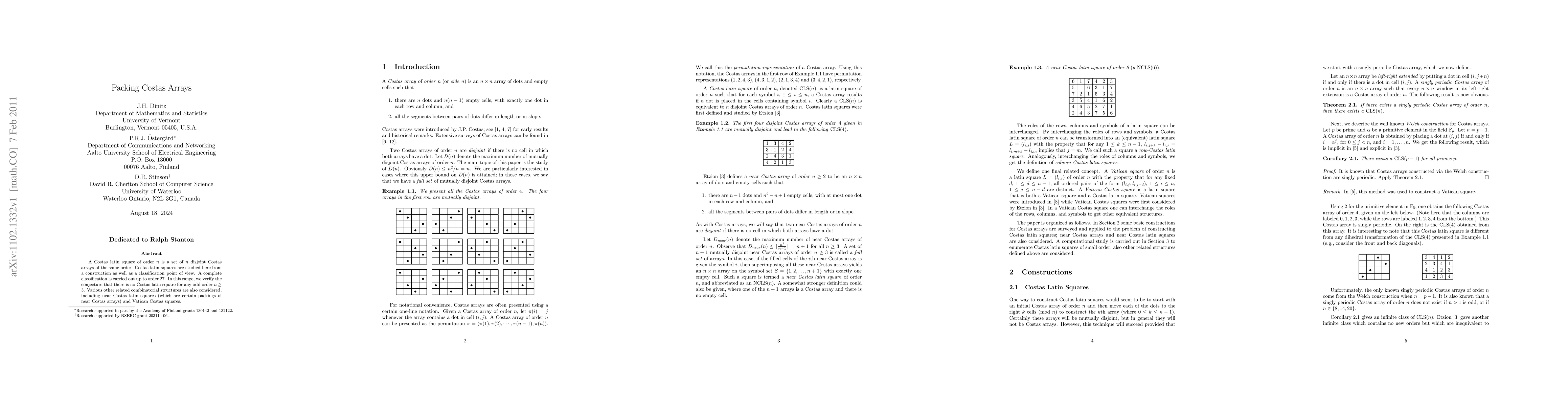 A Costas latin square of order n is a set of n disjoint Costas arrays of the same order. Costas latin squares are studied here from a construction as well as a classification point of view. A complete classification is carried out up to order 27. In this range, we verify the conjecture that there is no Costas latin square for any odd order n >= 3. Various other related combinatorial structures are also considered, including near Costas latin squares (which are certain packings of near Costas arrays) and Vatican Costas squares.