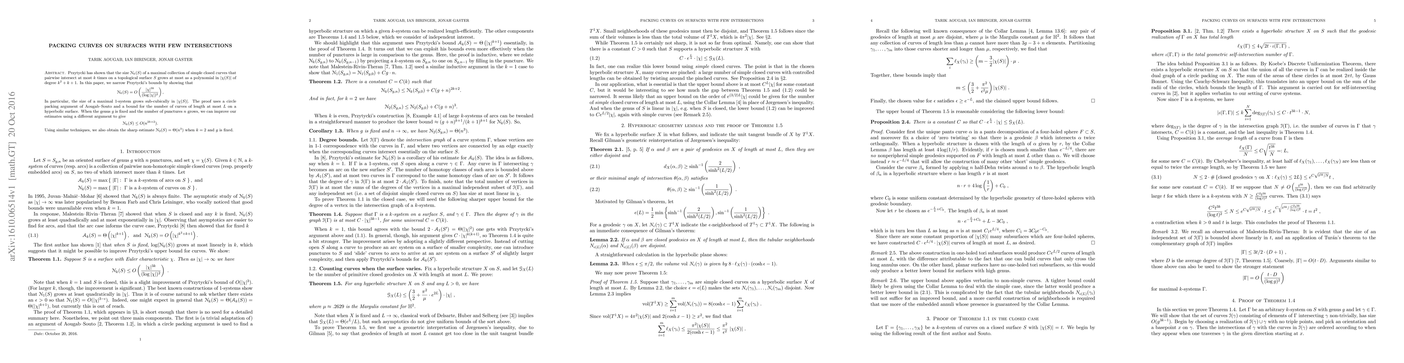 Przytycki has shown that the size $\mathcal{N}_{k}(S)$ of a maximal collection of simple closed curves that pairwise intersect at most $k$ times on a topological surface $S$ grows at most as a polynomial in $|\chi(S)|$ of degree $k^{2}+k+1$. In this paper, we narrow Przytycki's bounds by showing that $$ \mathcal{N}_{k}(S) =O \left( \frac{ |\chi|^{3k}}{ ( \log |\chi| )^2 } \right) , $$ In particular, the size of a maximal 1-system grows sub-cubically in $|\chi(S)|$. The proof uses a circle packing argument of Aougab-Souto and a bound for the number of curves of length at most $L$ on a hyperbolic surface. When the genus $g$ is fixed and the number of punctures $n$ grows, we can improve our estimates using a different argument to give $$ \mathcal{N}_{k}(S) \leq O(n^{2k+2}) . $$ Using similar techniques, we also obtain the sharp estimate $\mathcal{N}_{2}(S)=\Theta(n^3)$ when $k=2$ and $g$ is fixed.