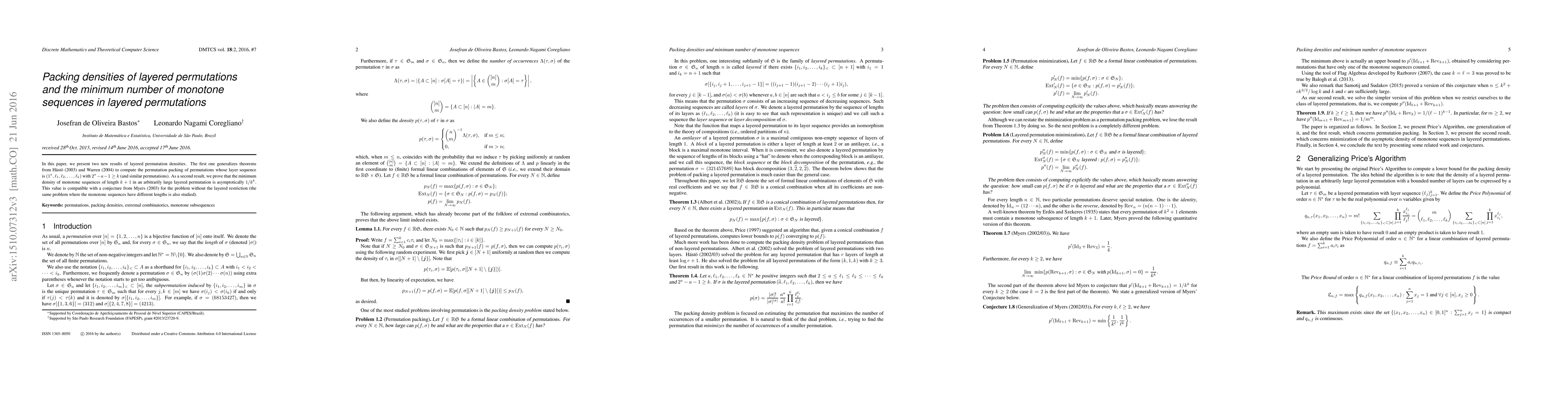 In this paper, we present two new results of layered permutation densities. The first one generalizes theorems from H\"{a}st\"{o} (2003) and Warren (2004) to compute the permutation packing of permutations whose layer sequence is~$(1^a,\ell_1,\ell_2,\ldots,\ell_k)$ with~$2^a-a-1\geq k$ (and similar permutations). As a second result, we prove that the minimum density of monotone sequences of length~$k+1$ in an arbitrarily large layered permutation is asymptotically~$1/k^k$. This value is compatible with a conjecture from Myers (2003) for the problem without the layered restriction (the same problem where the monotone sequences have different lengths is also studied).