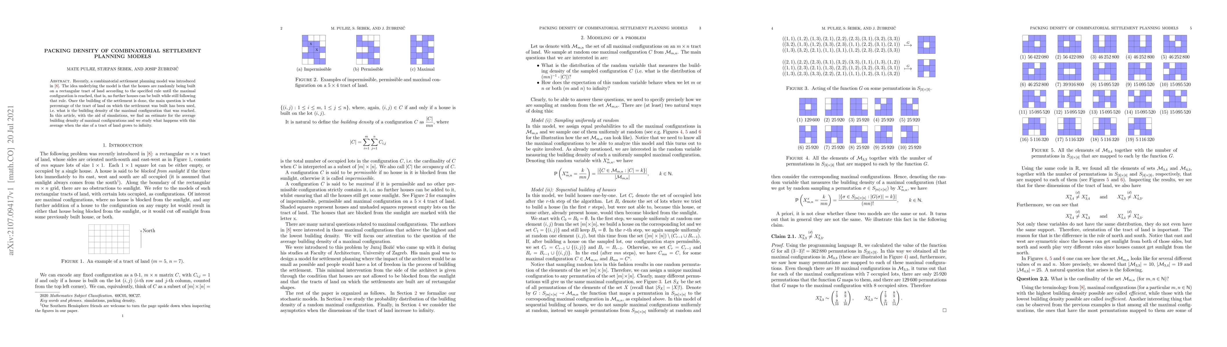 Recently, a combinatorial settlement planning model was introduced. The idea underlying the model is that the houses are randomly being built on a rectangular tract of land according to the specified rule until the maximal configuration is reached, that is, no further houses can be built while still following that rule. Once the building of the settlement is done, the main question is what percentage of the tract of land on which the settlement was built has been used, i.e. what is the building density of the maximal configuration that was reached. In this article, with the aid of simulations, we find an estimate for the average building density of maximal configurations and we study what happens with this average when the size of a tract of land grows to infinity.