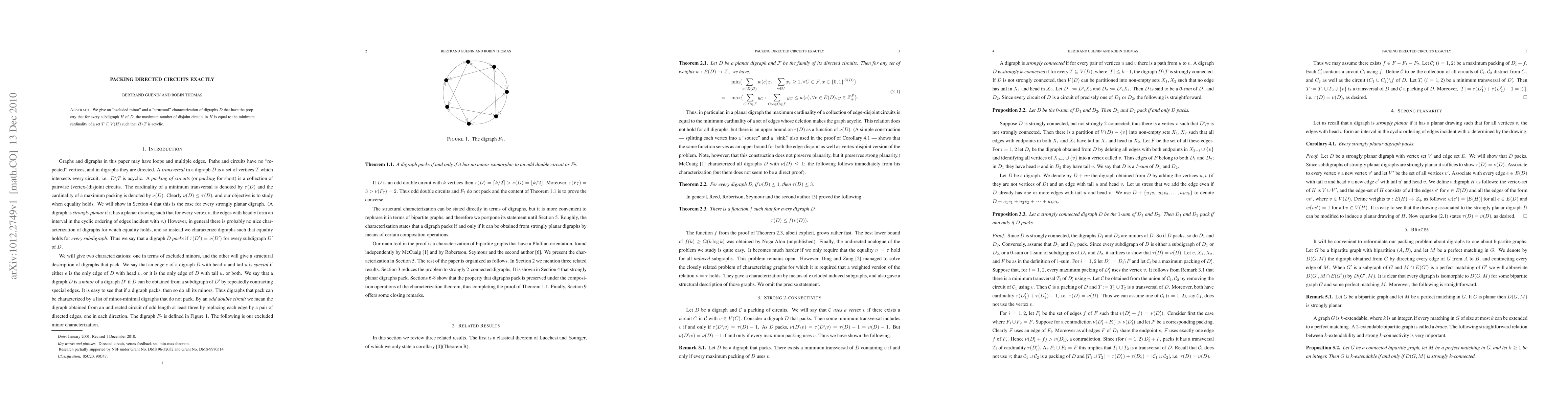 The paper provides structural and excluded minor characterizations for digraphs where the maximum number of disjoint circuits in any subdigraph equals the minimum subset T of V(H) such that H\T is acyclic.
