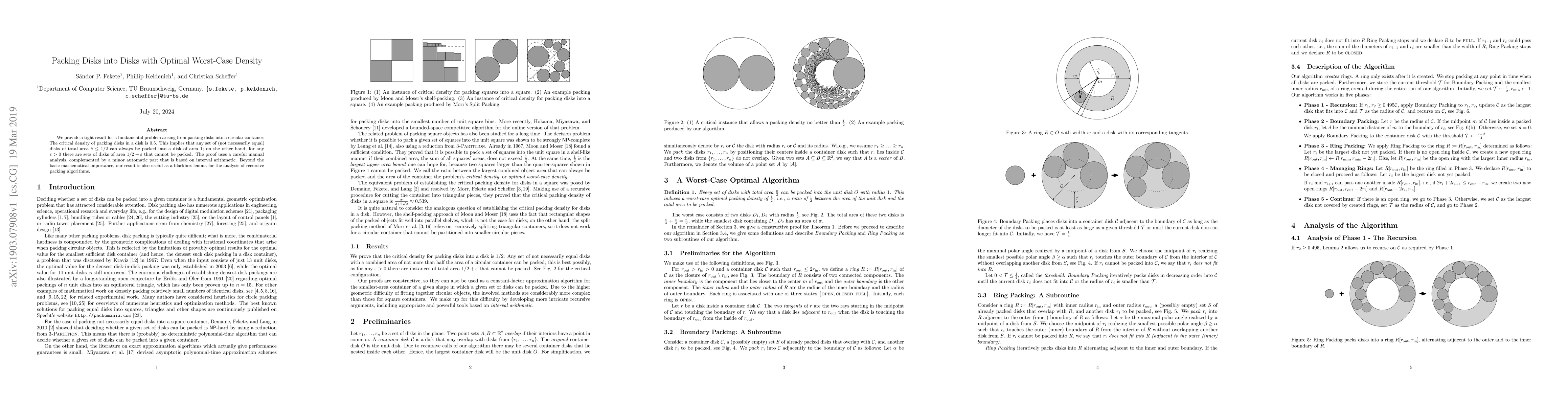 This paper establishes the optimal worst-case density for packing disks into a circular container, proving that the critical density is exactly 0.5. It provides a rigorous proof combining manual analysis and a minor automated component, and serves as a foundational lemma for recursive packing algorithm analysis.