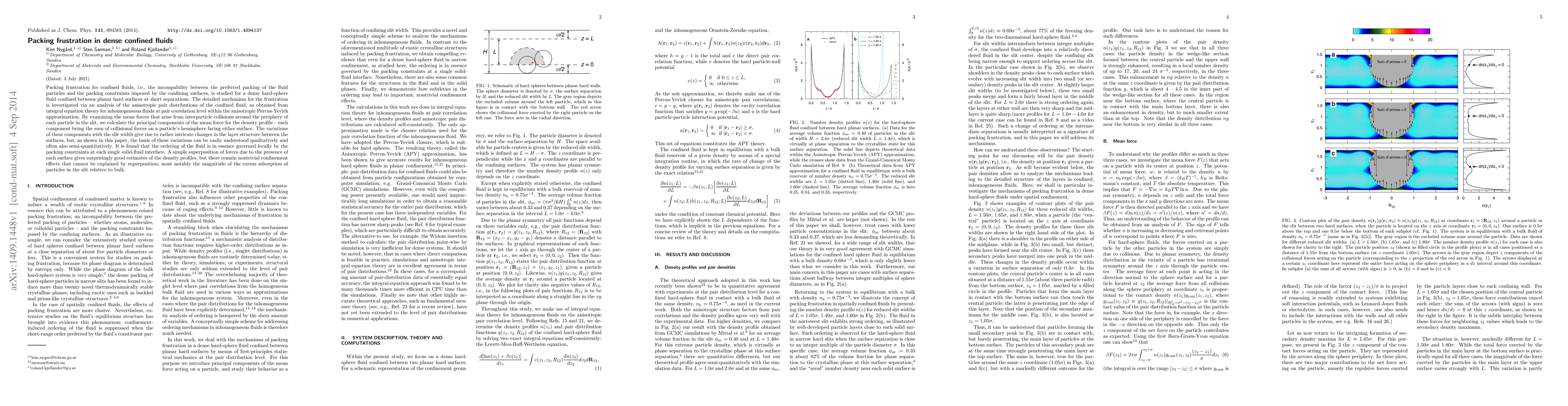 Packing frustration for confined fluids, i.e., the incompatibility between the preferred packing of the fluid particles and the packing constraints imposed by the confining surfaces, is studied for a dense hard-sphere fluid confined between planar hard surfaces at short separations. The detailed mechanism for the frustration is investigated via an analysis of the anisotropic pair distributions of the confined fluid, as obtained from integral equation theory for inhomogeneous fluids at pair correlation level within the anisotropic Percus-Yevick approximation. By examining the mean forces that arise from interparticle collisions around the periphery of each particle in the slit, we calculate the principal components of the mean force for the density profile - each component being the sum of collisional forces on a particle's hemisphere facing either surface. The variations of these components with the slit width give rise to rather intricate changes in the layer structure between the surfaces, but, as shown in this paper, the basis of these variations can be easily understood qualitatively and often also semi-quantitatively. It is found that the ordering of the fluid is in essence governed locally by the packing constraints at each single solid-fluid interface. A simple superposition of forces due to the presence of each surface gives surprisingly good estimates of the density profiles, but there remain nontrivial confinement effects that cannot be explained by superposition, most notably the magnitude of the excess adsorption of particles in the slit relative to bulk.